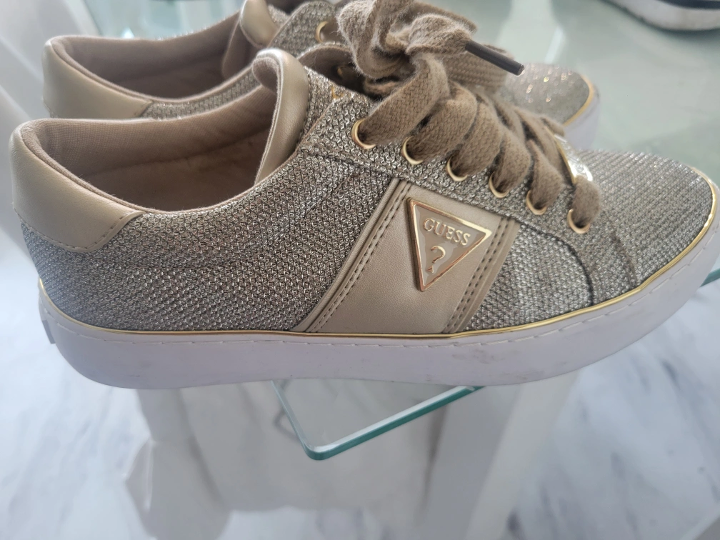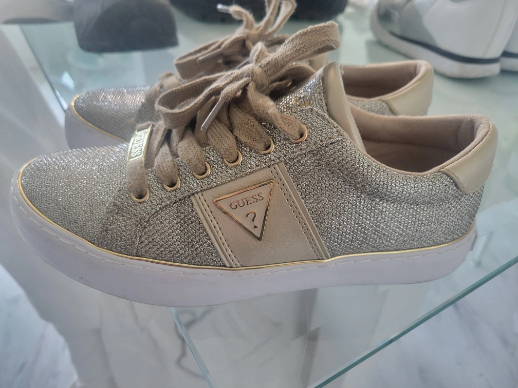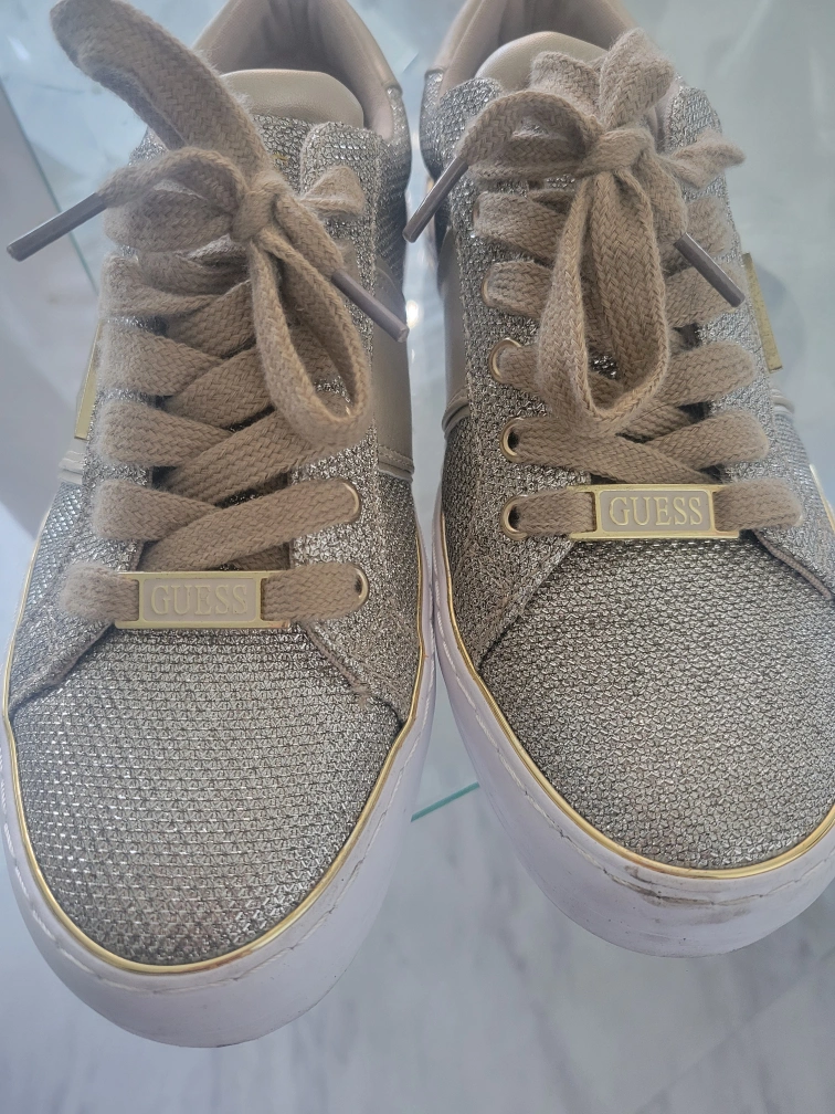 279These are gold glitter sneakers with brown laces and a white sole. They feature the Guess logo on the side and the back of the shoe.