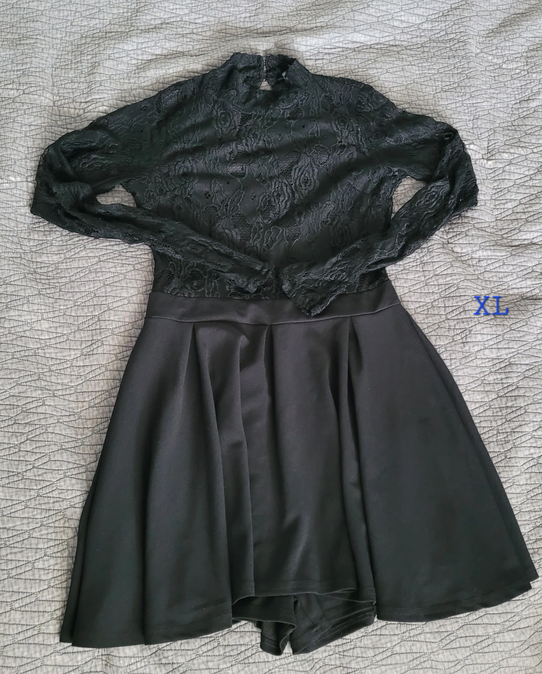 A long-sleeved black dress with a lace bodice and a skater skirt. The dress has a high neckline and a zipper in the back. The skirt is flowy and hits above the knee. The dress is in great condition worn twice size XL