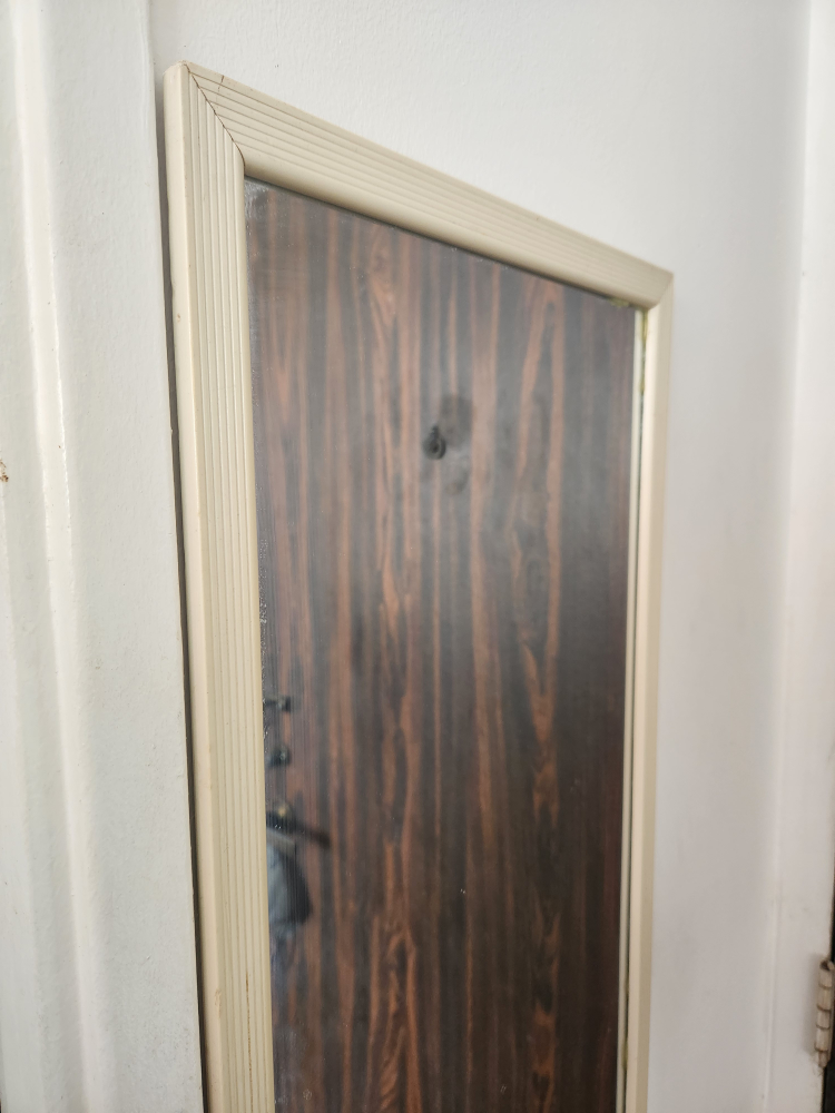 A full-length mirror with a white frame.