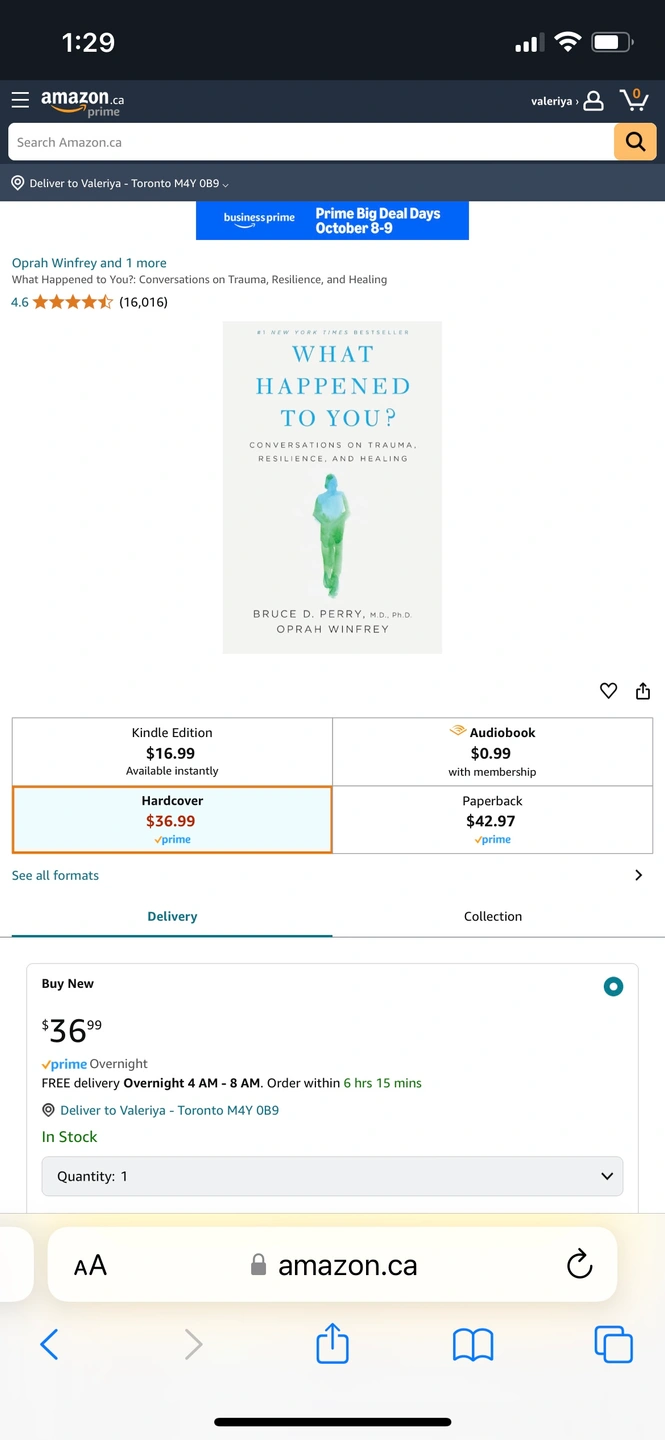 You can check Indigo listing here: https://www.indigo.ca/en-ca/what-happened-to-you-conversations-on-trauma-resilience-and-healing/9781250223180.html