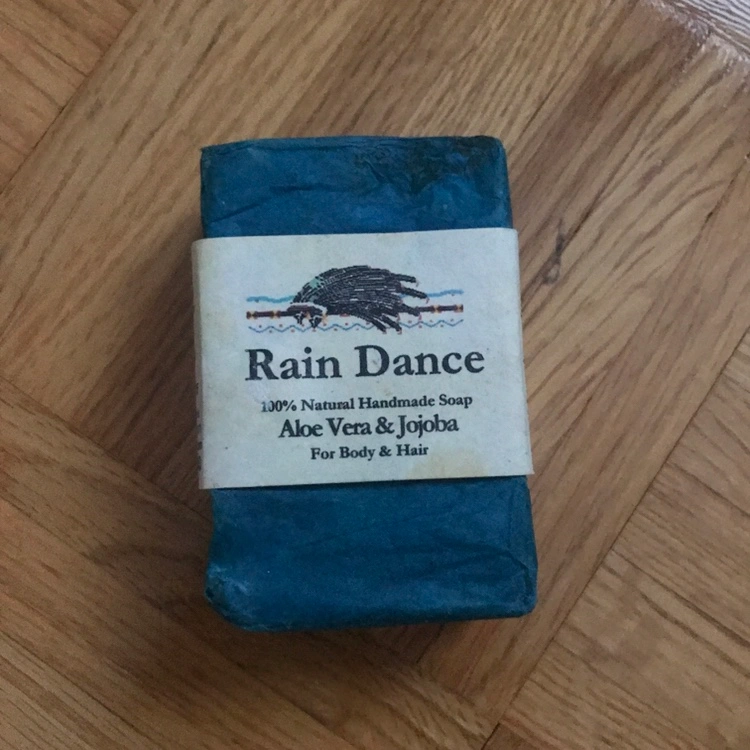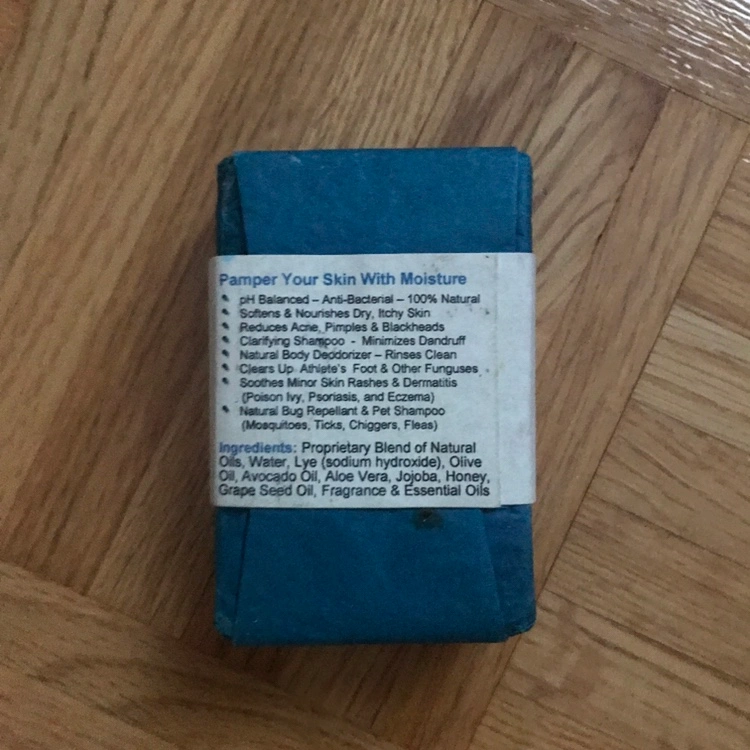 Handmade soap bar in a blue paper wrapper. Ingredients include aloe vera and jojoba. Suitable for body and hair. pH balanced.