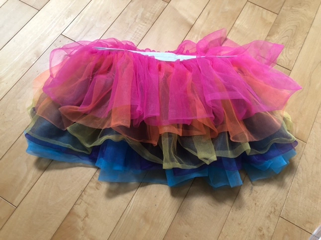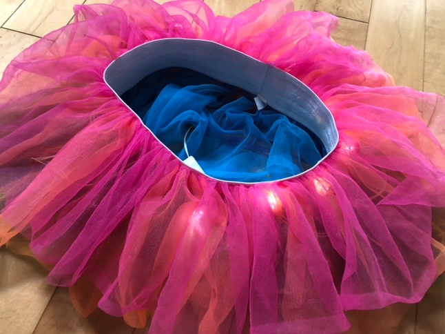A rainbow tulle tutu with white lights attached to the waistband. The lights have a battery pack that is attached to the waistband. Perfect for a costume or party.