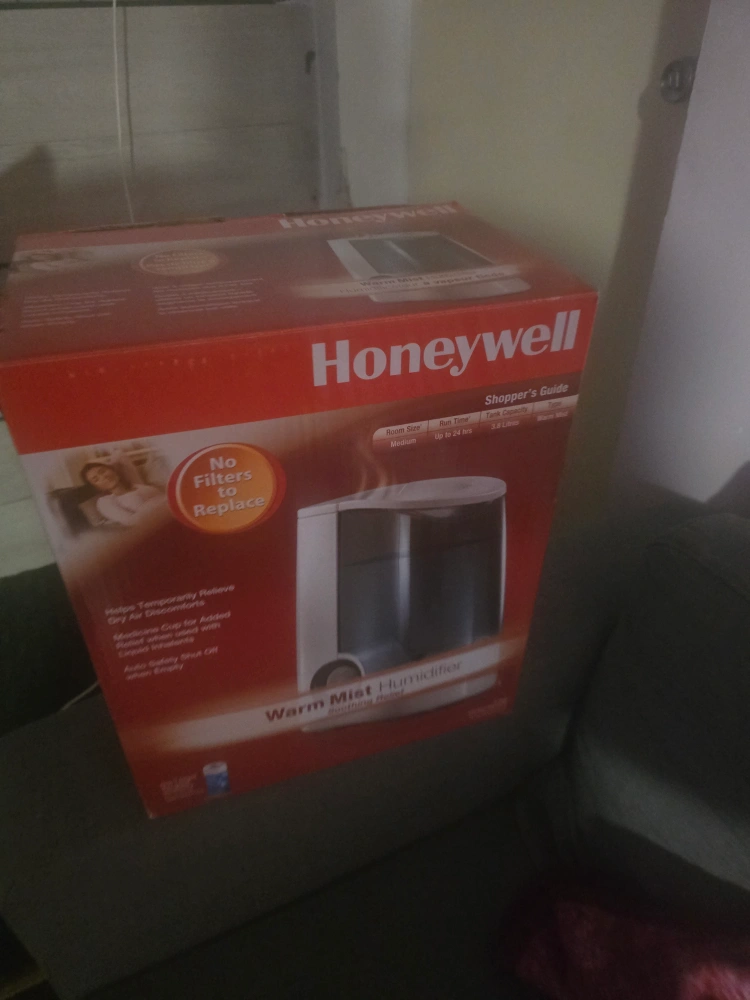 A Honeywell Warm Mist Humidifier in the original box. This is a medium room size humidifier that can run for up to 24 hours. It has a 3.8 litre tank capacity. it's barely been used, in like new condition.
