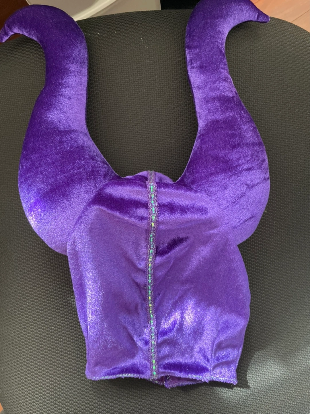Purple velvet headband with horns and a sparkly trim.