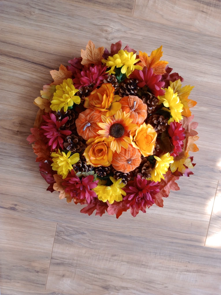 106A beautiful homemade fall-themed centerpiece featuring pumpkins, sunflowers, fall-coloured flower and leaves
