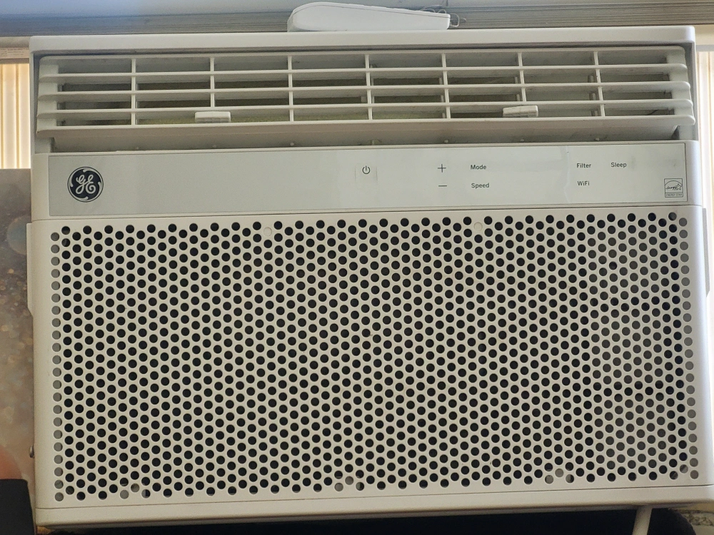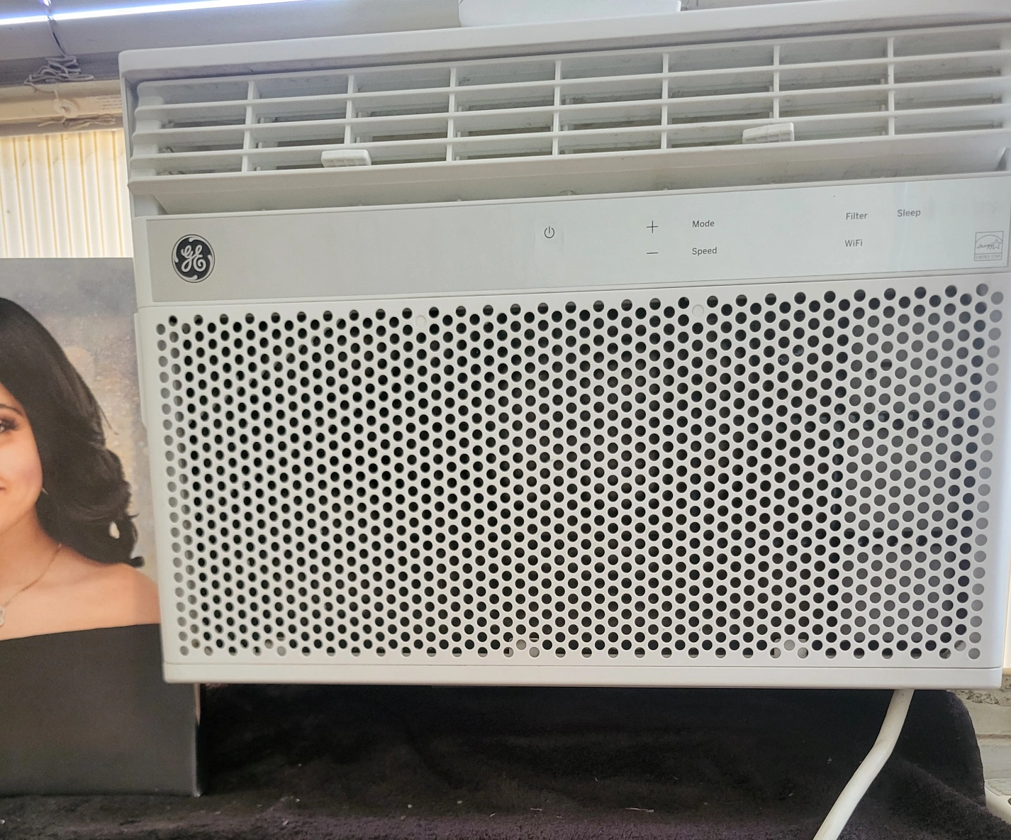 GE window air conditioner with WiFi capabilities and various speed and mode settings. Comes with remote control. Ready to use.