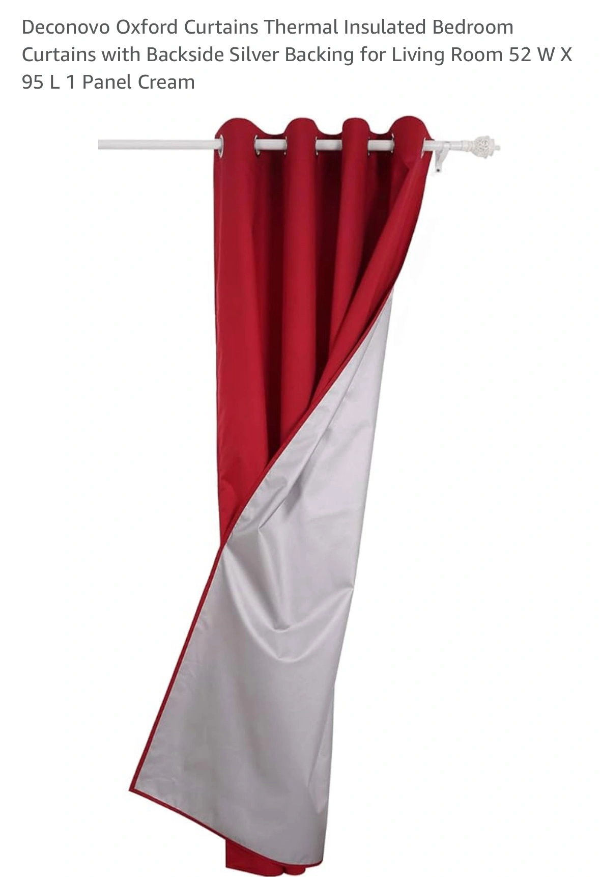 One panel blackout drapes with silver grommets. 52 inch wide by 95 inch long. Made of 100% polyester. Thermal insulated. Imported. Good for blocking light and noise. Machine wash cold. Iron at low temperature.