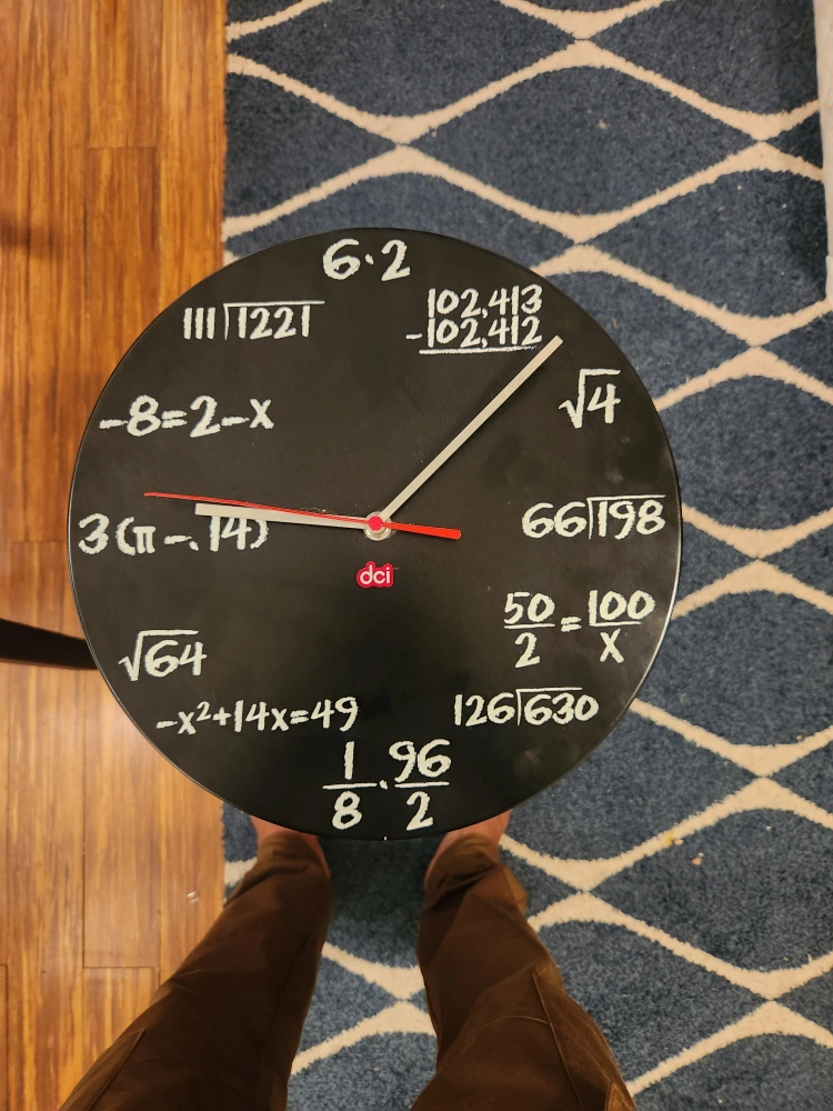 A unique and stylish clock with the appearance of a high school math chalkboard. each hour is represented by a mathematical equation. minute and second hands are slightly bent. or else I would've listed item as like new.