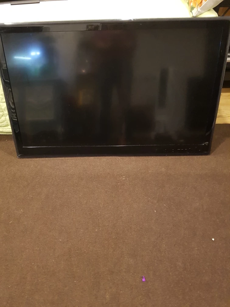 A 40 inch television with black casing and a black screen. It has a power cord but no remote it is in good condition, just want to dispose
