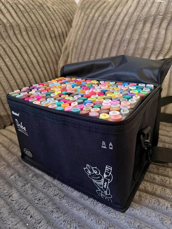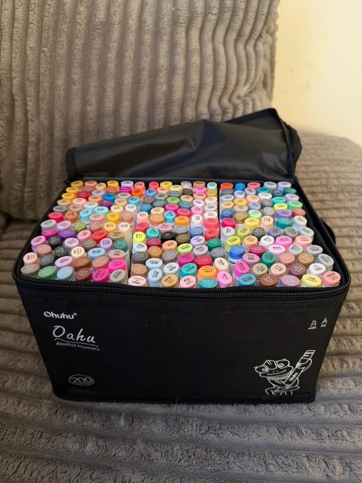 This is a set of 200 Ohuhu alcohol markers, perfect for artists. It includes dual-tipped markers with a fine tip for details and a wide chisel tip for coloring larger areas. The set comes with 200 vibrant colors and a colorless blender, all using dye-based ink for seamless blending and quick drying. The markers are highly pigmented and suitable for various art and design projects.