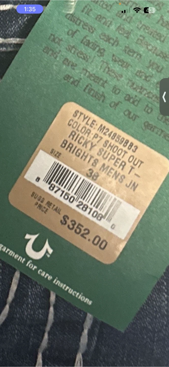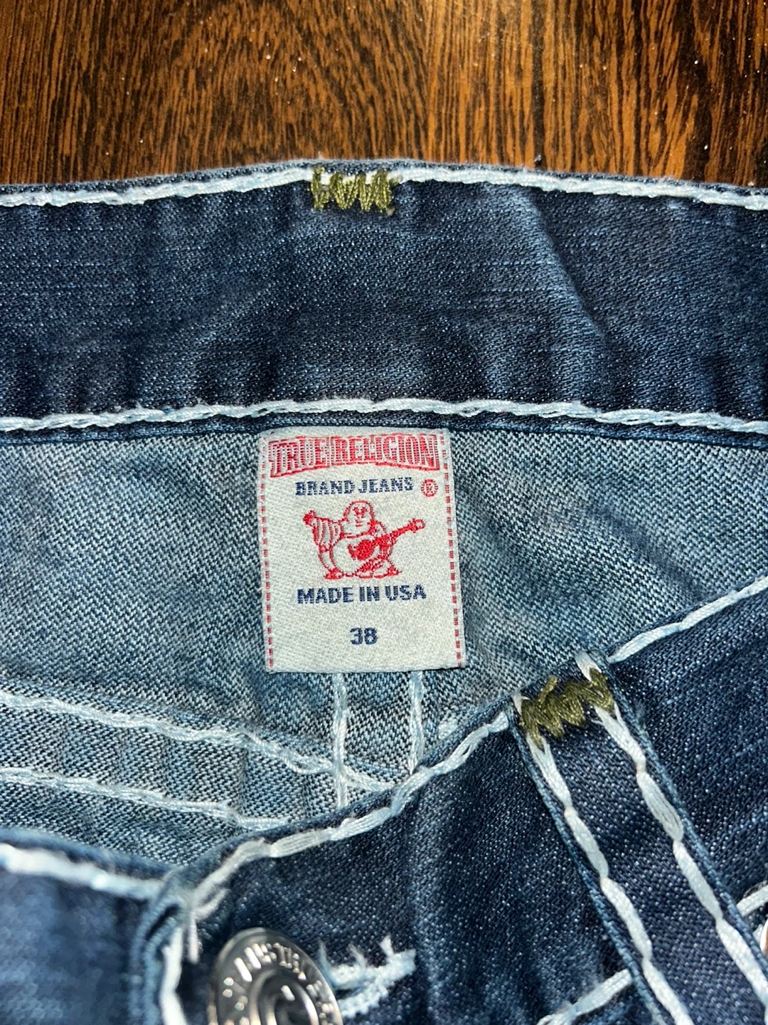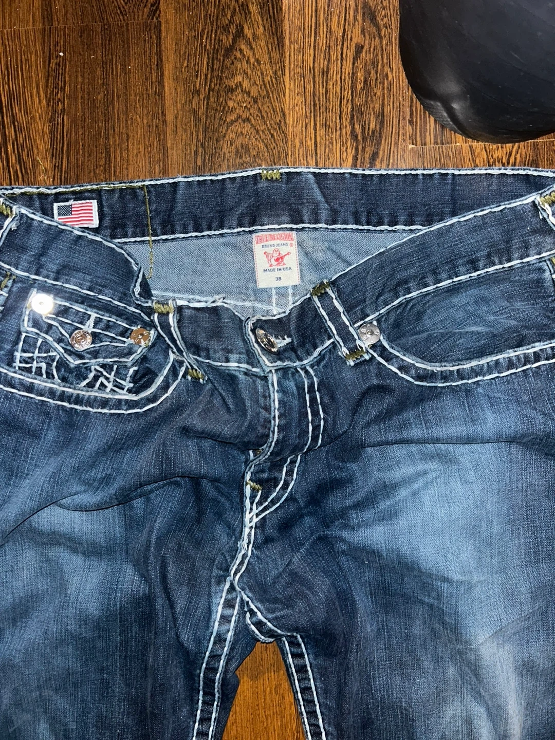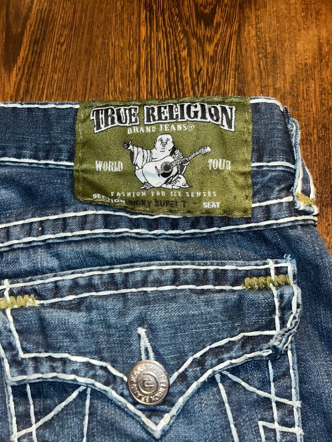 Classic World Tour, True Religion denim jeans with white stitching detail.