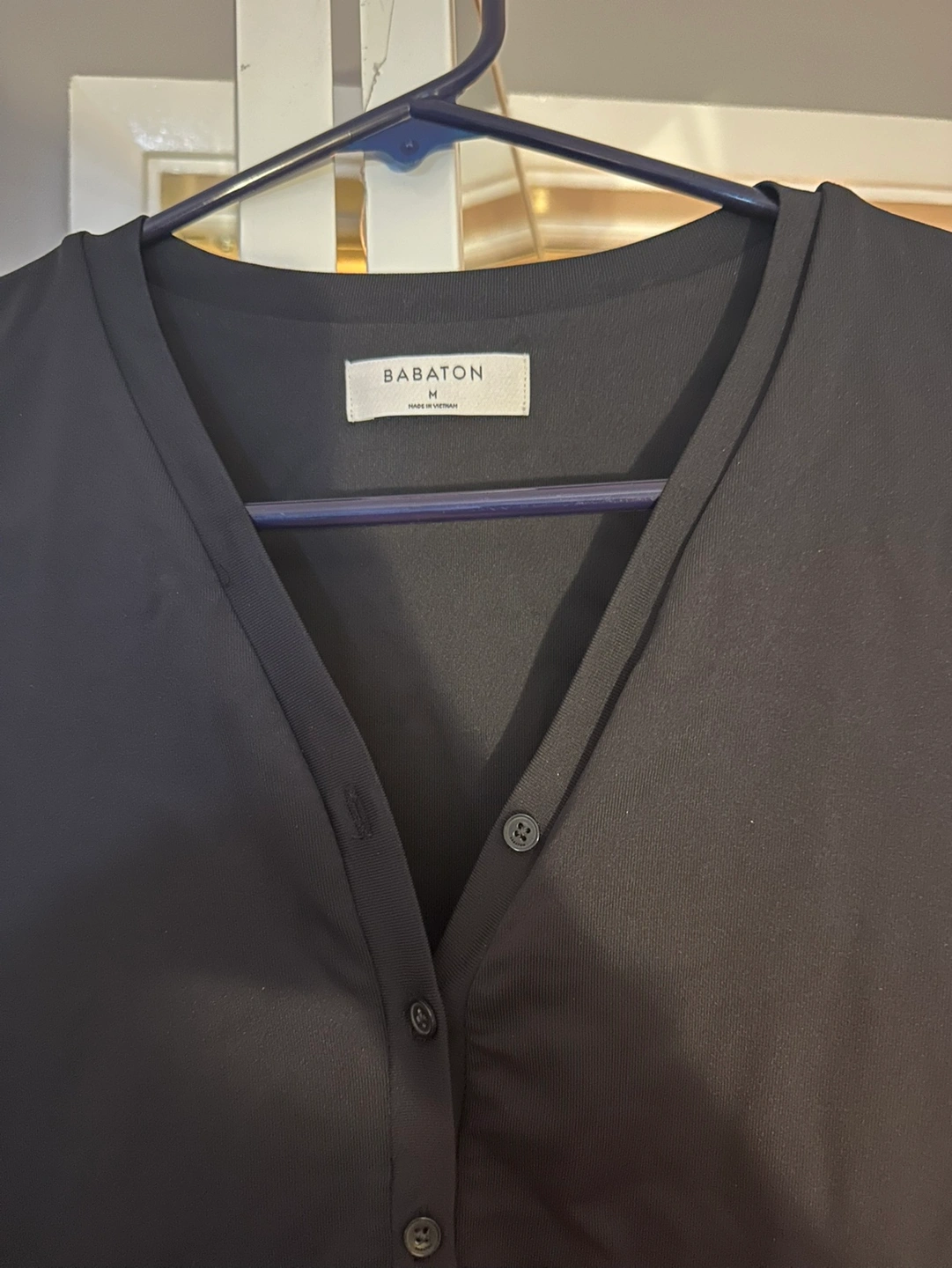 32Black bodysuit with a V-neck and long sleeves. Has button closures at the top.