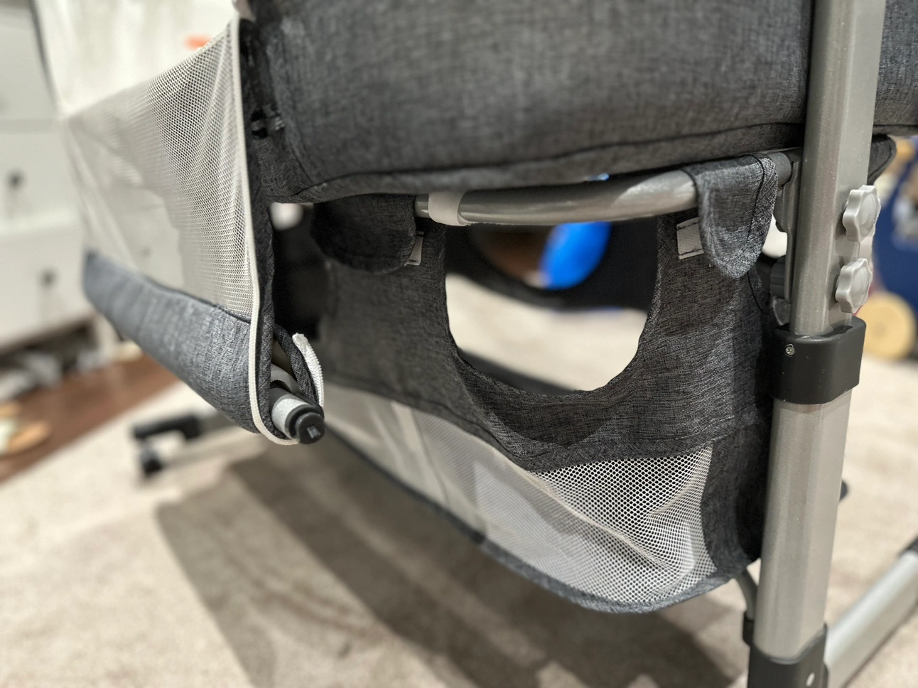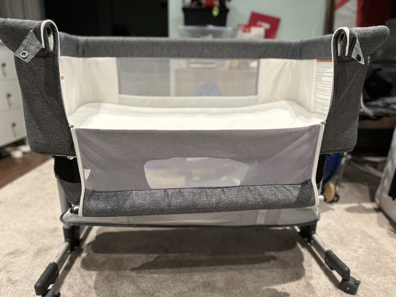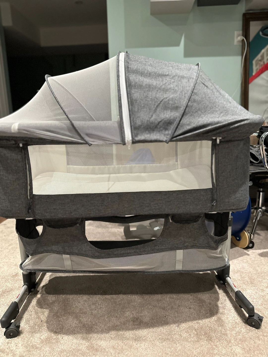 Grey co-sleeper with mesh sides and a canopy. Has wheels and adjustable height.