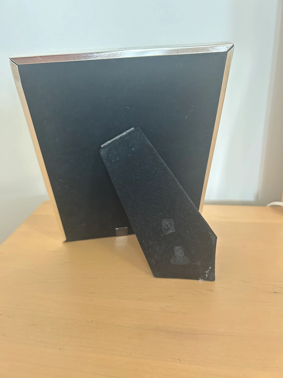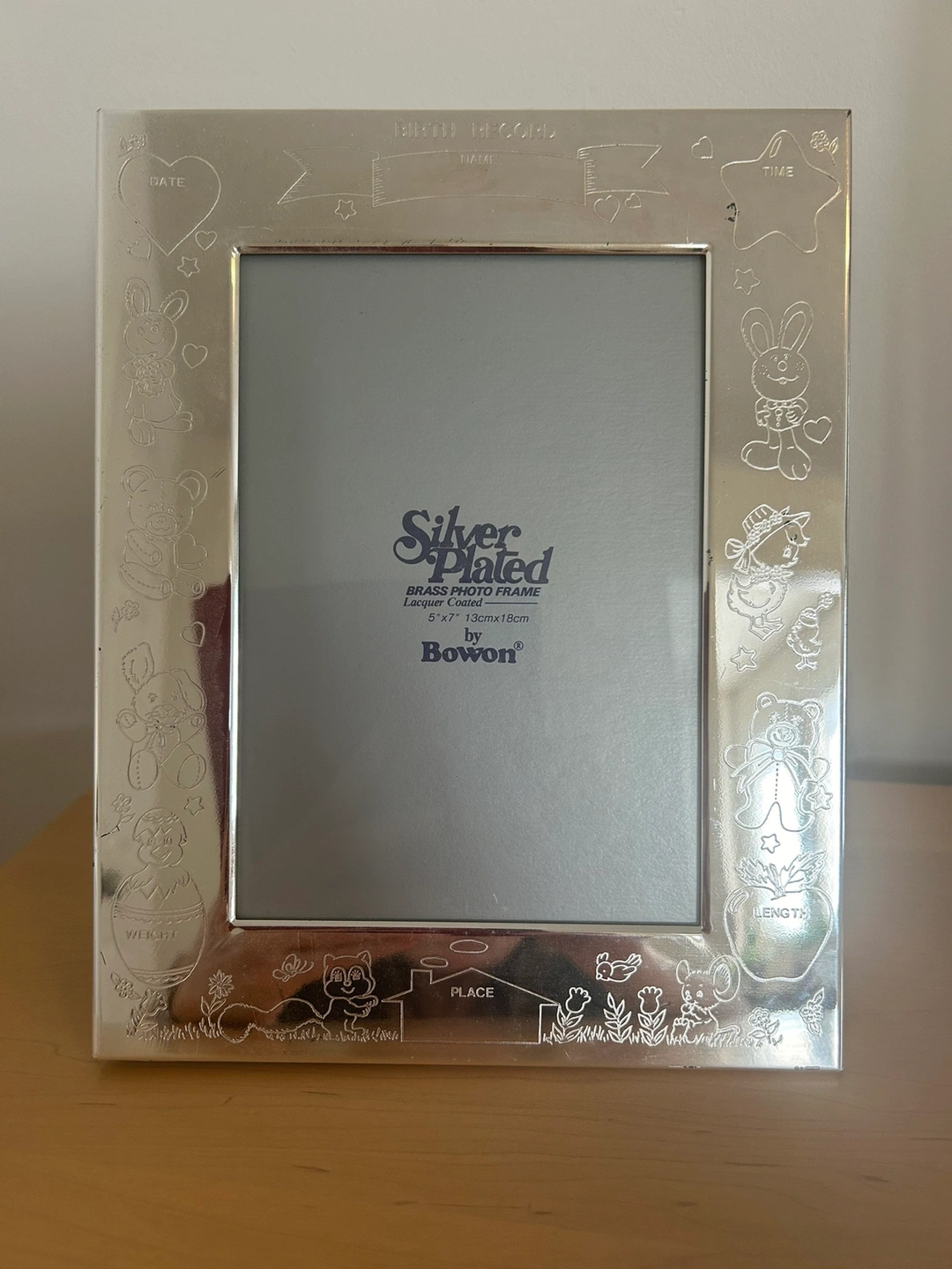 A silver-plated photo frame with an engraved design of children's toys. The frame has a stand on the back so it can be displayed vertically or horizontally. It's marked "Silver Plated Brass Photo Frame Lacquer Coated 5" x 7" 13cm x 18cm by Bowon" on the back.