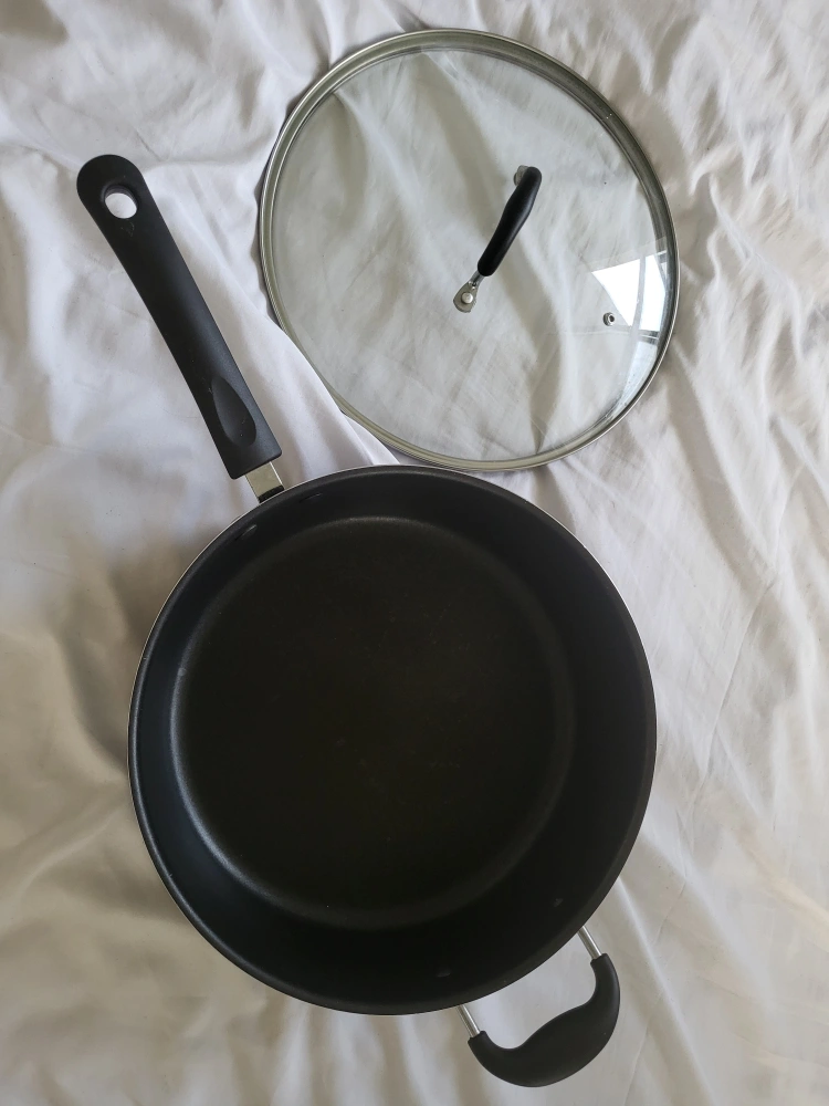 A black pot with a glass lid and two handles. It's like new as you could see from handle bolts.