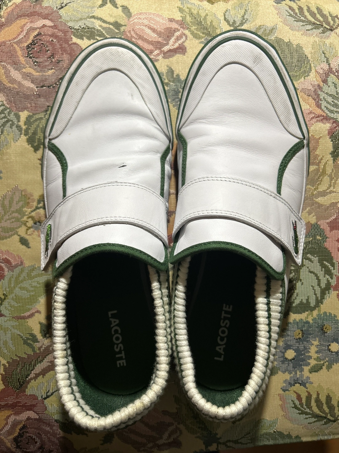 Men's Lacoste sneakers in white leather with green accents. The shoes are a slip-on style with a velcro strap. The shoes have a green rubber sole. The shoes are size 8 1/2.