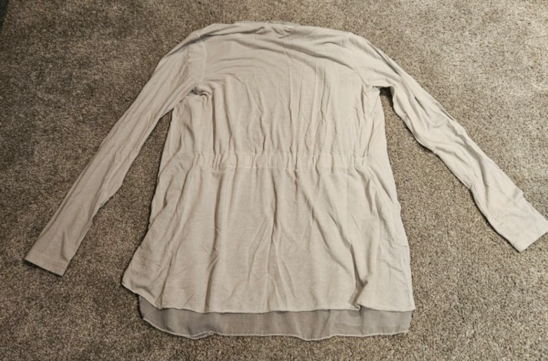 A long-sleeved, grey cardigan with a chiffon overlay. It features a cinched waist and a relaxed fit. Very stretchy and cozy. Hardly worn.