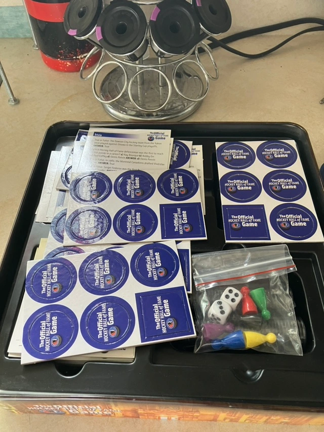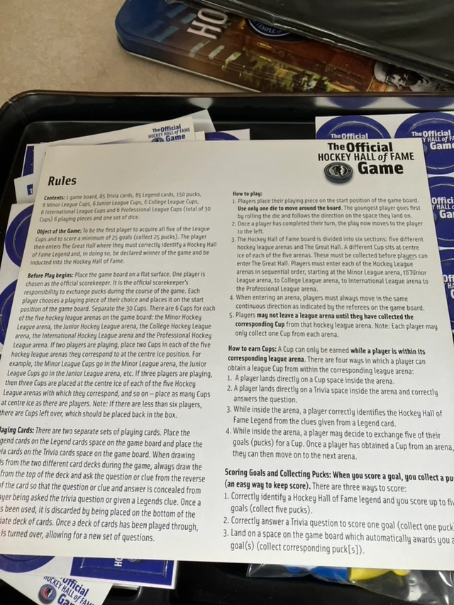 The Official Hockey Hall of Fame Game board game in a metal tin. The game includes the board, dice, playing pieces, cards, and pucks. The game is in good condition, not even opened but has some wear and tear on the metal box Open for offers please no lowball and please take a look at more of my ads.