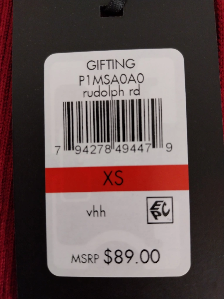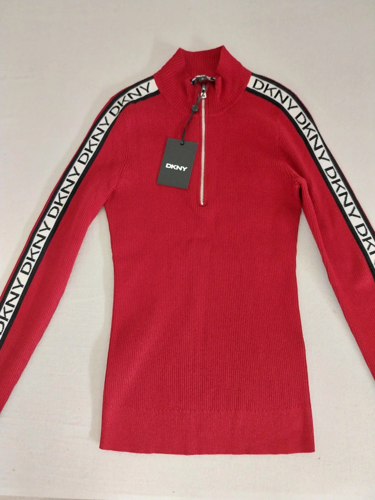 Red long sleeve sweater with black and white trim. Zipper front. Size XS. Has a tag attached with a $89.00 USD retail.