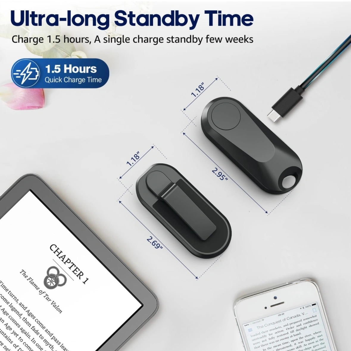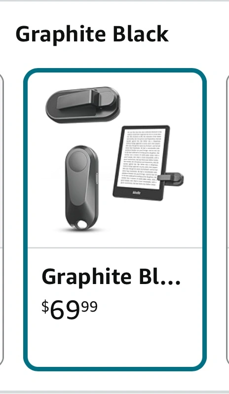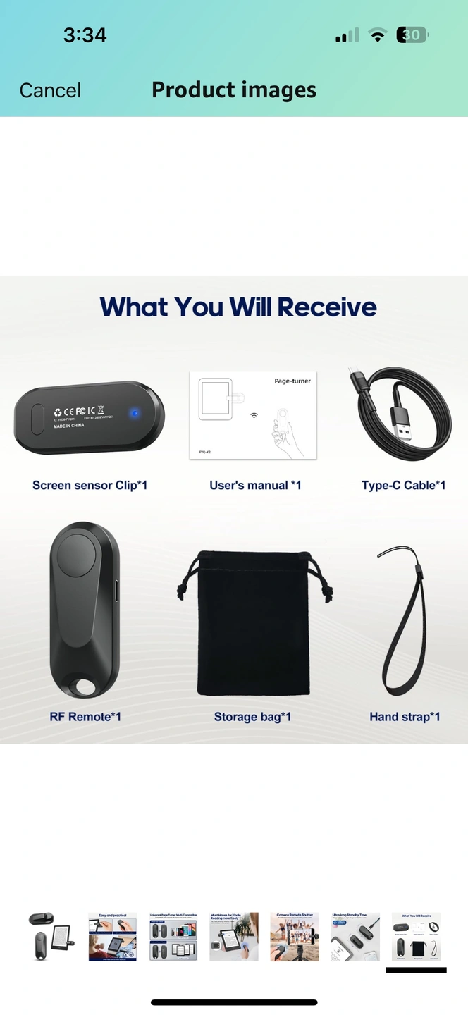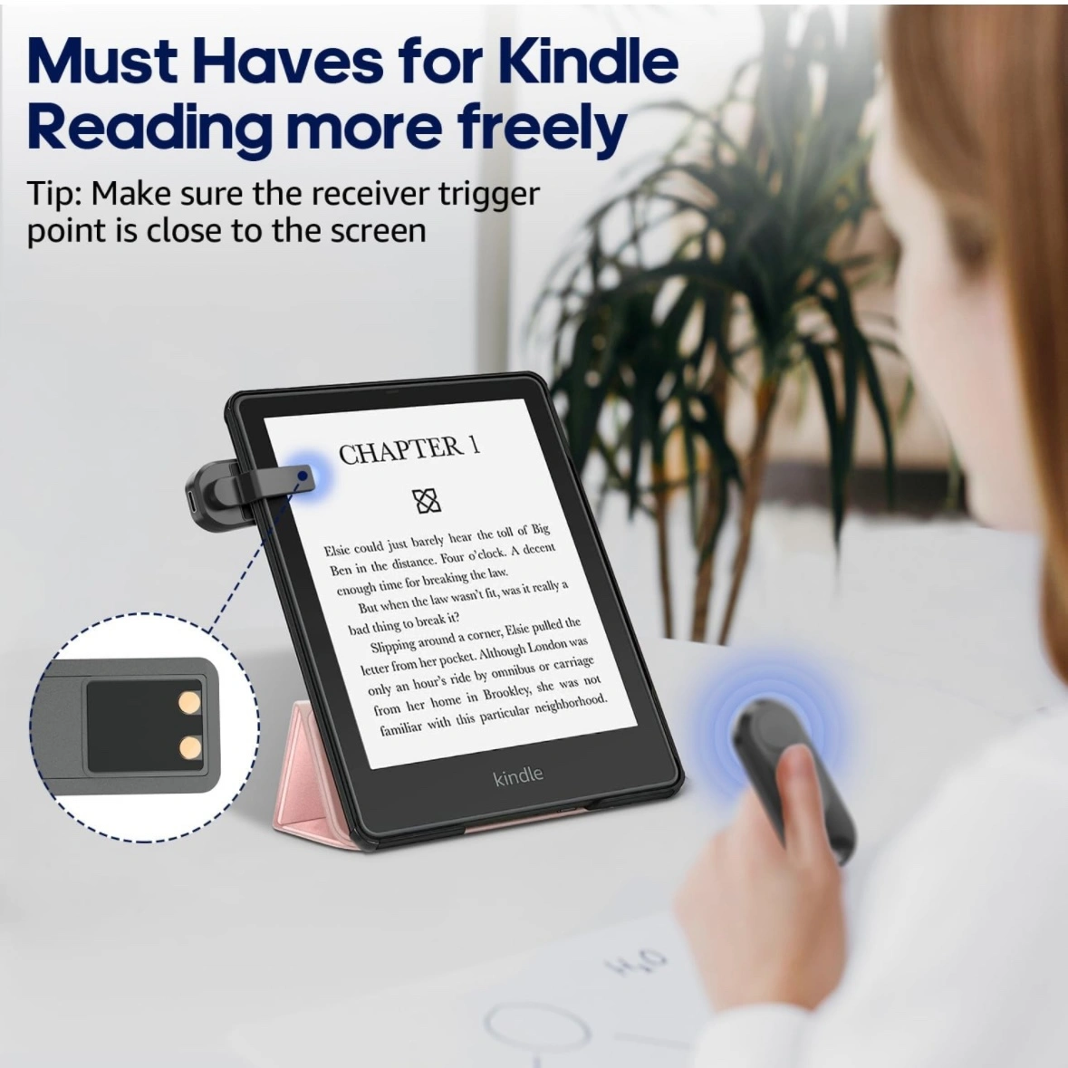 RF remote control page turner for e-readers and tablets. The device attaches to the device's screen using a clip. It has a remote control that allows you to turn pages without touching the screen. It is compatible with a variety of devices, including Kindle, Kobo, and iPad.