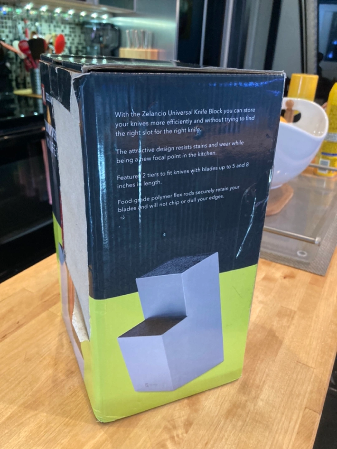 214Only taken out of the package for pictures. Very stylish modern knife block. Holds your 8” cutting utensils and 5” steak knives. Without slots this is very versatile. Easy cleaning with removable rods. Outer box slightly marred - does not affect product at all.
