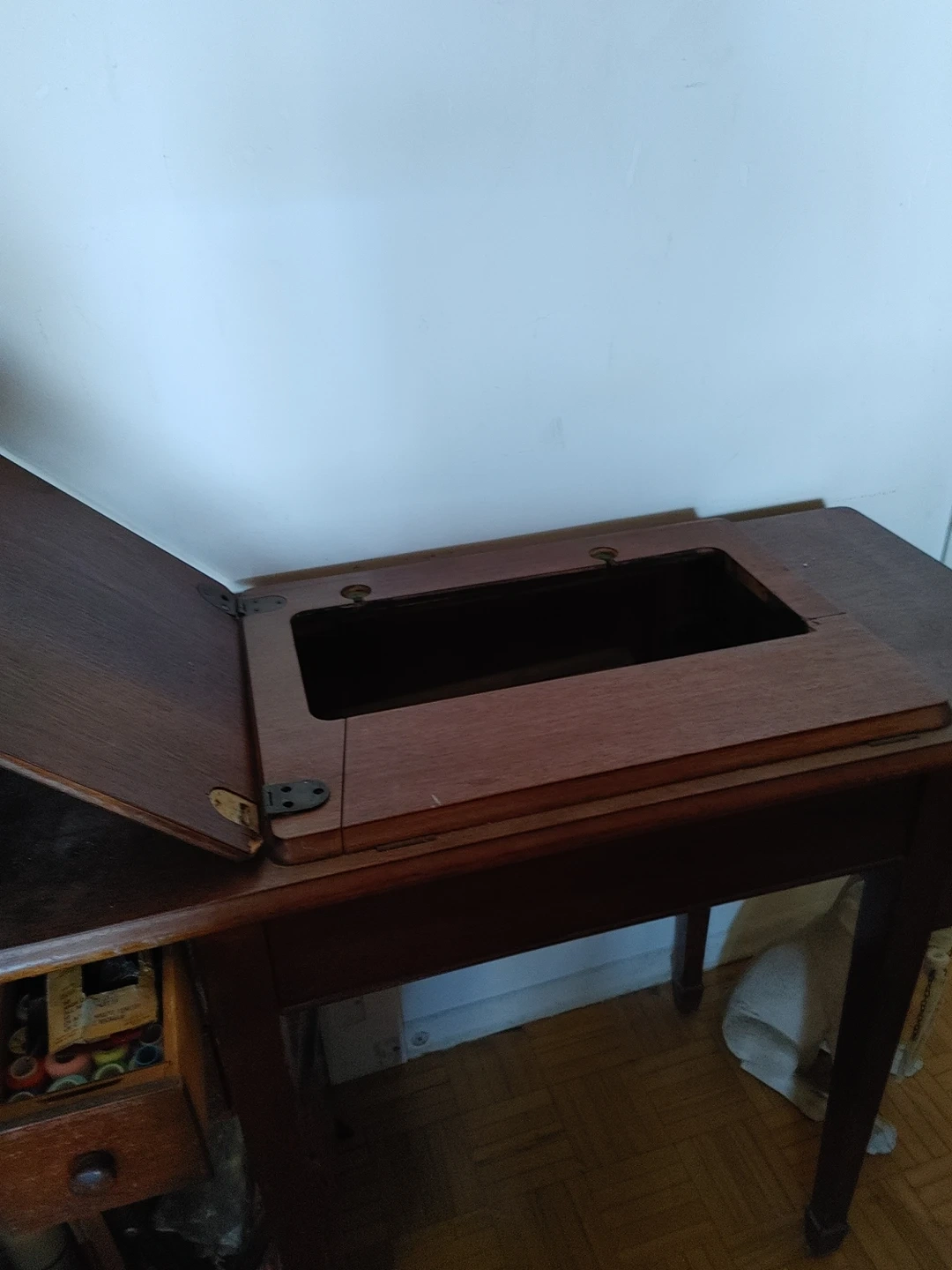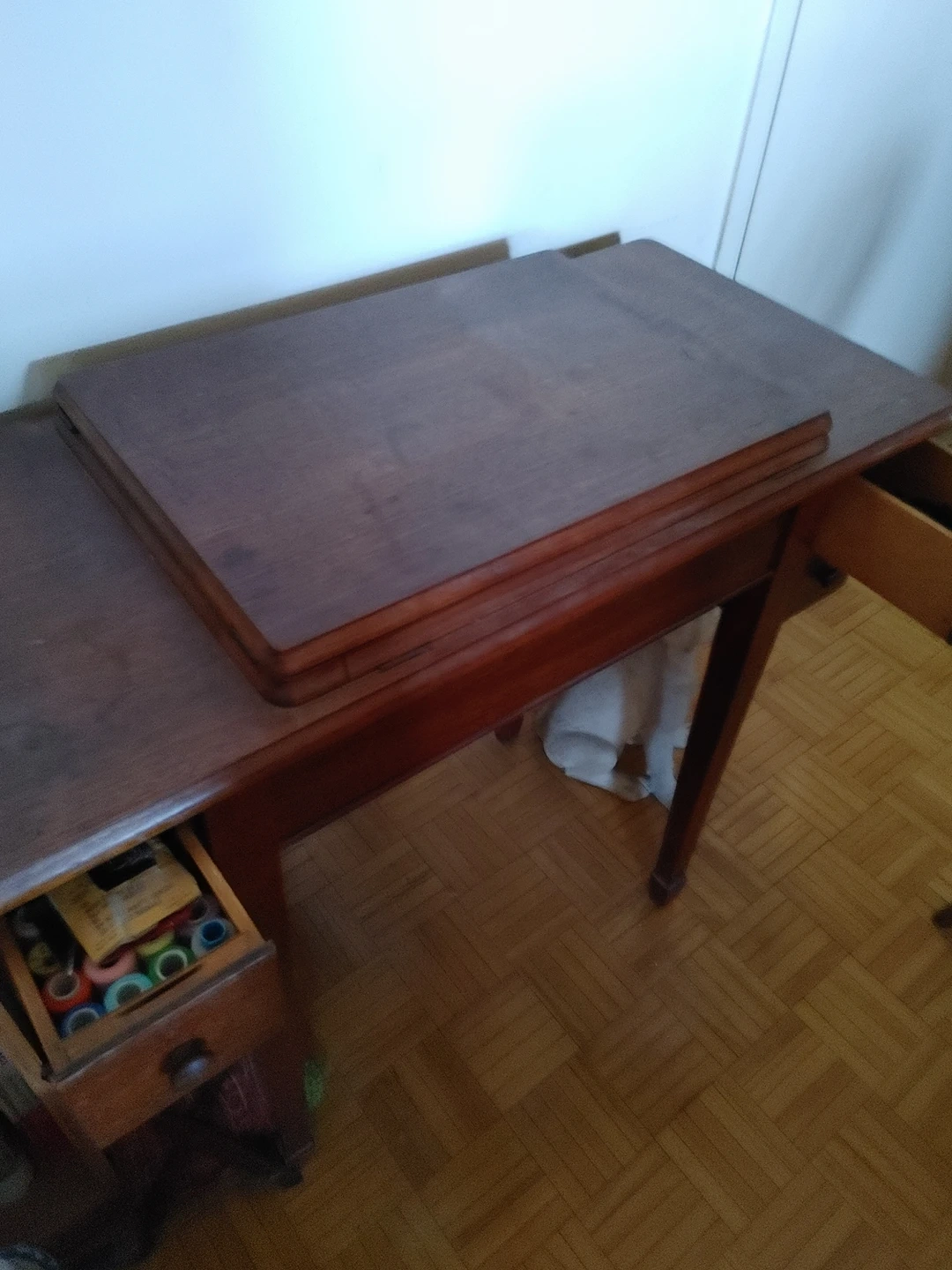 This sewing table is from 1943. Sewing machine not included. No deep scratches. Made of real maple wood.