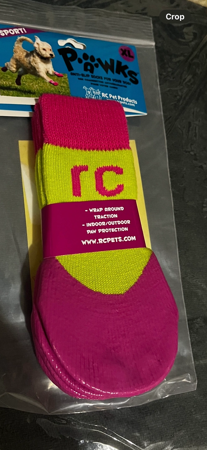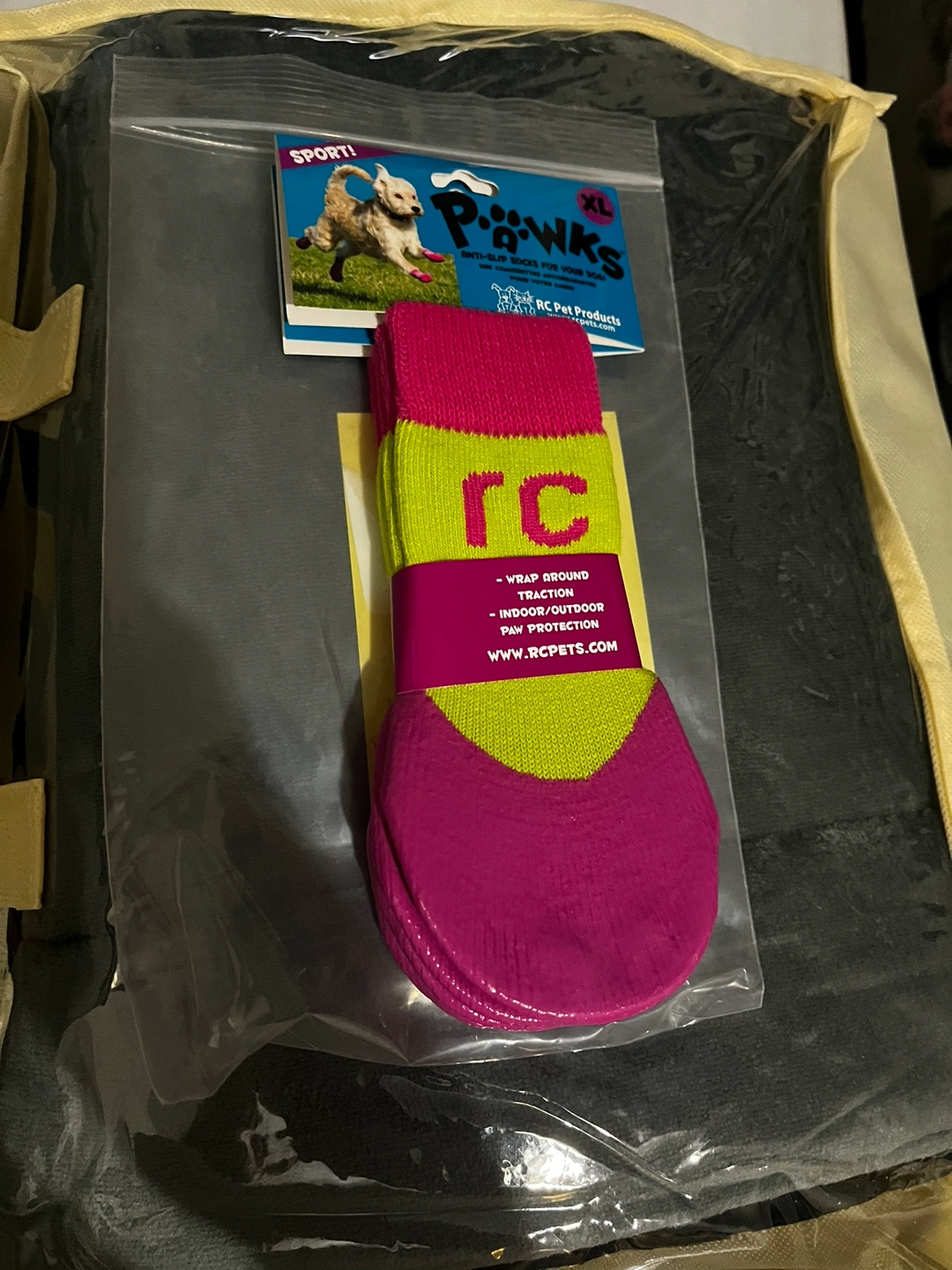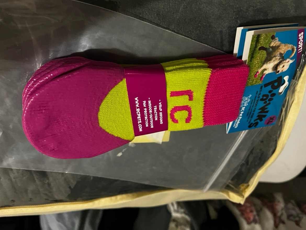 Dog socks for small dogs in pink and lime green. They are a wrap-around design with traction for indoor and outdoor use.
