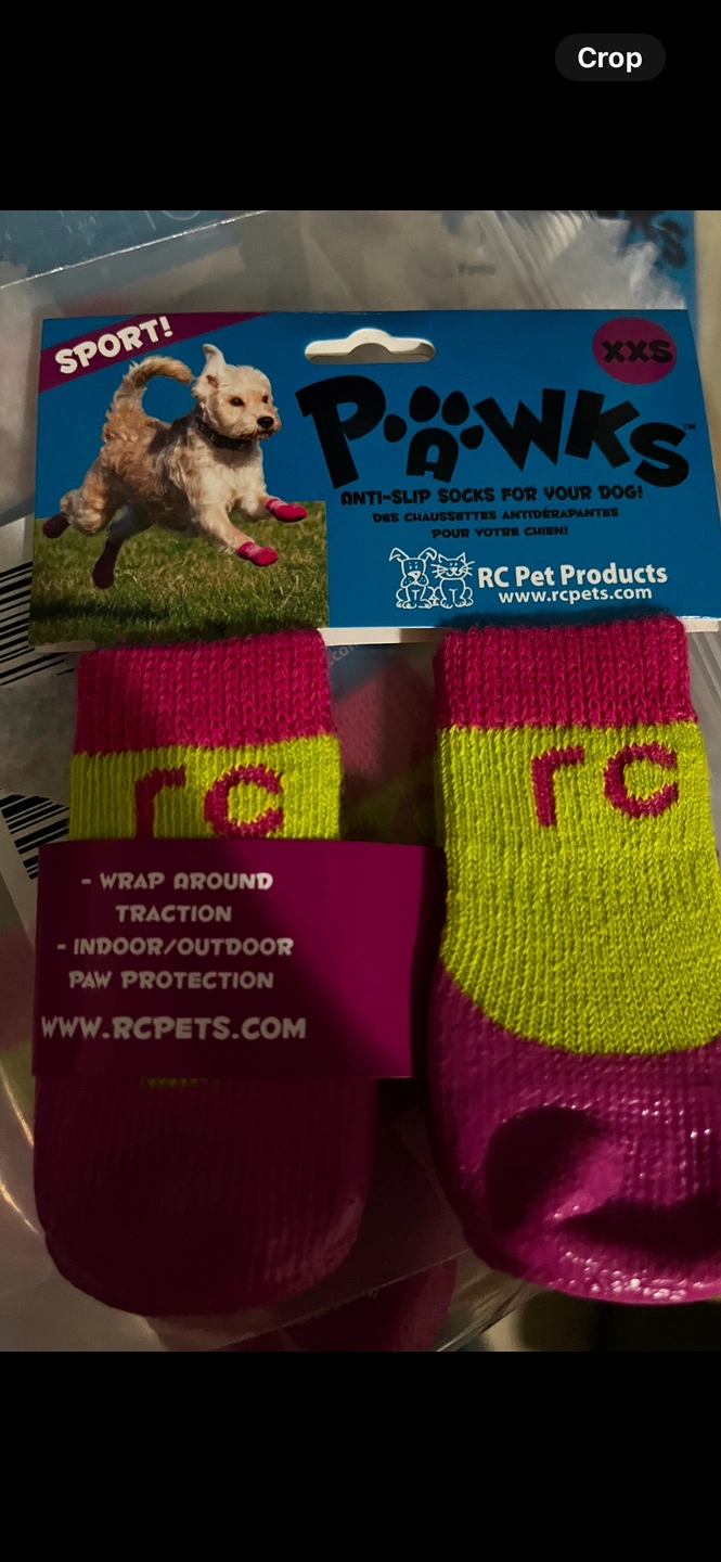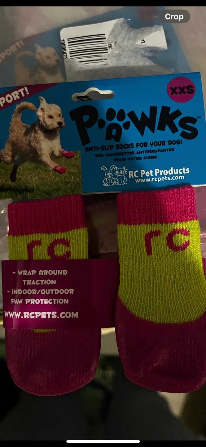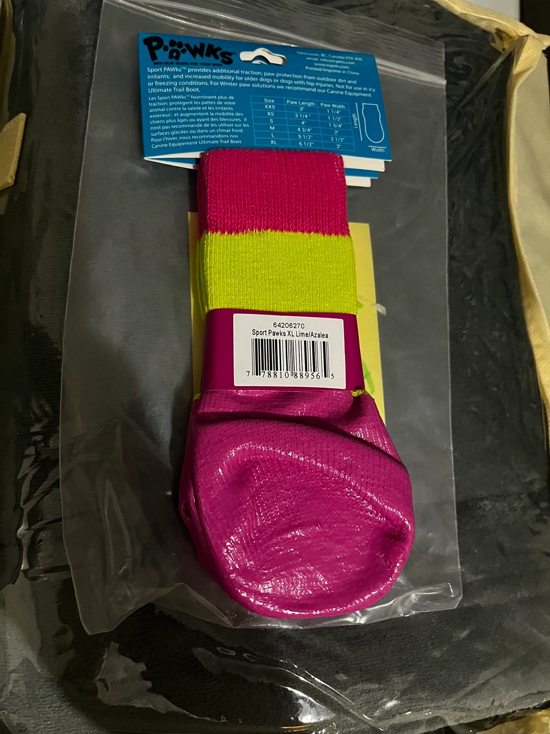 Dog socks for small dogs in pink and lime green. They are a wrap-around design with traction for indoor and outdoor use.
