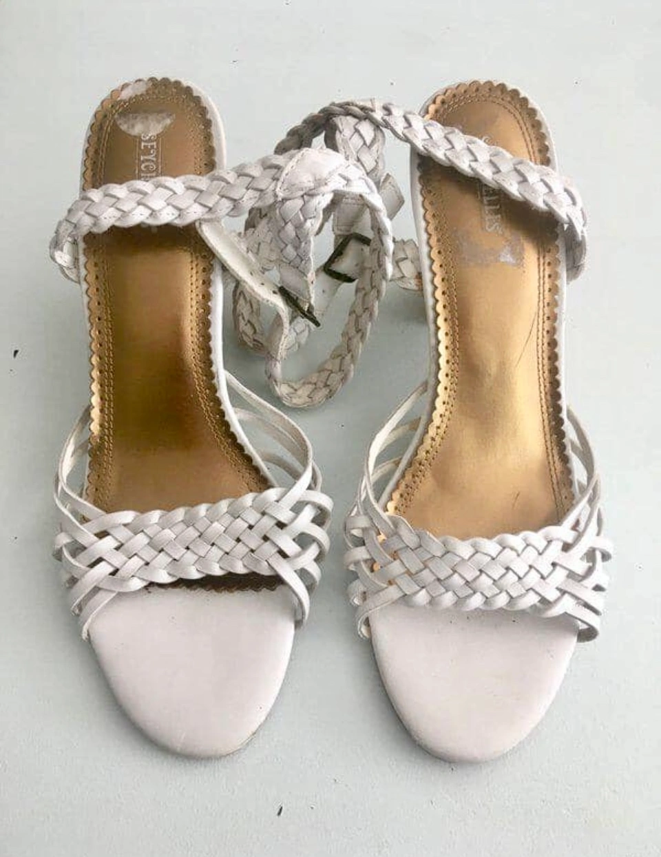 White Seychelles braided wedges with ankle strap. Size 10. Made in China. Leather upper, balance man made. Only worn once!