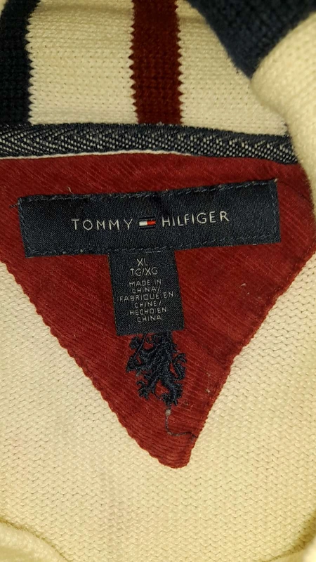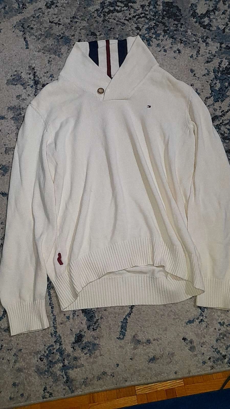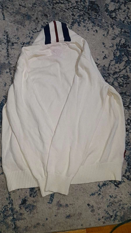 25White sweater with red, white, and blue detail on the collar.