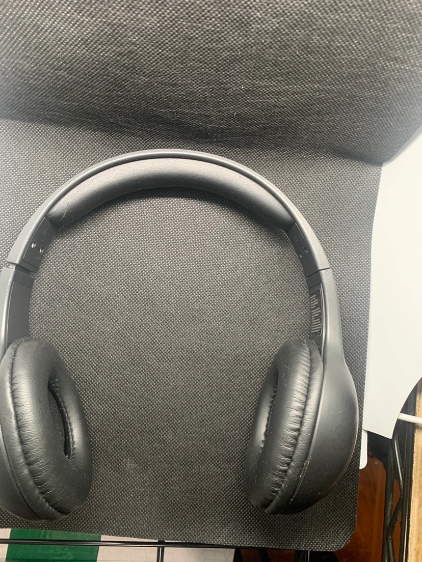Black over-ear headphones with padding around the ear cups. The headphones are wireless got these at 5 below, still connects to your device but sound and mic quality suffers