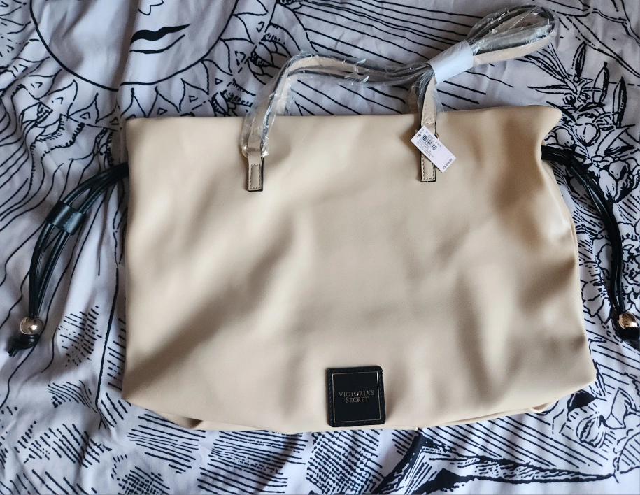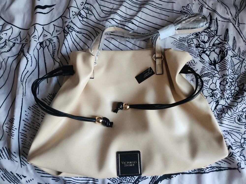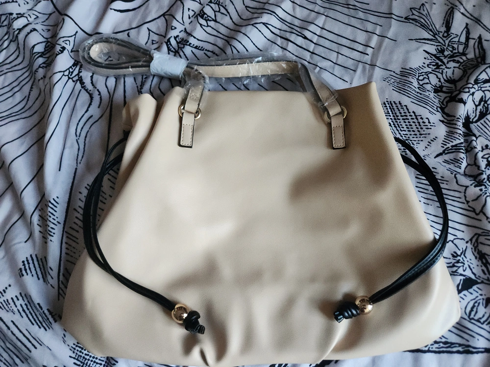 982Firm price. Beige handbag with black accents and a gold logo. Includes a long shoulder strap.