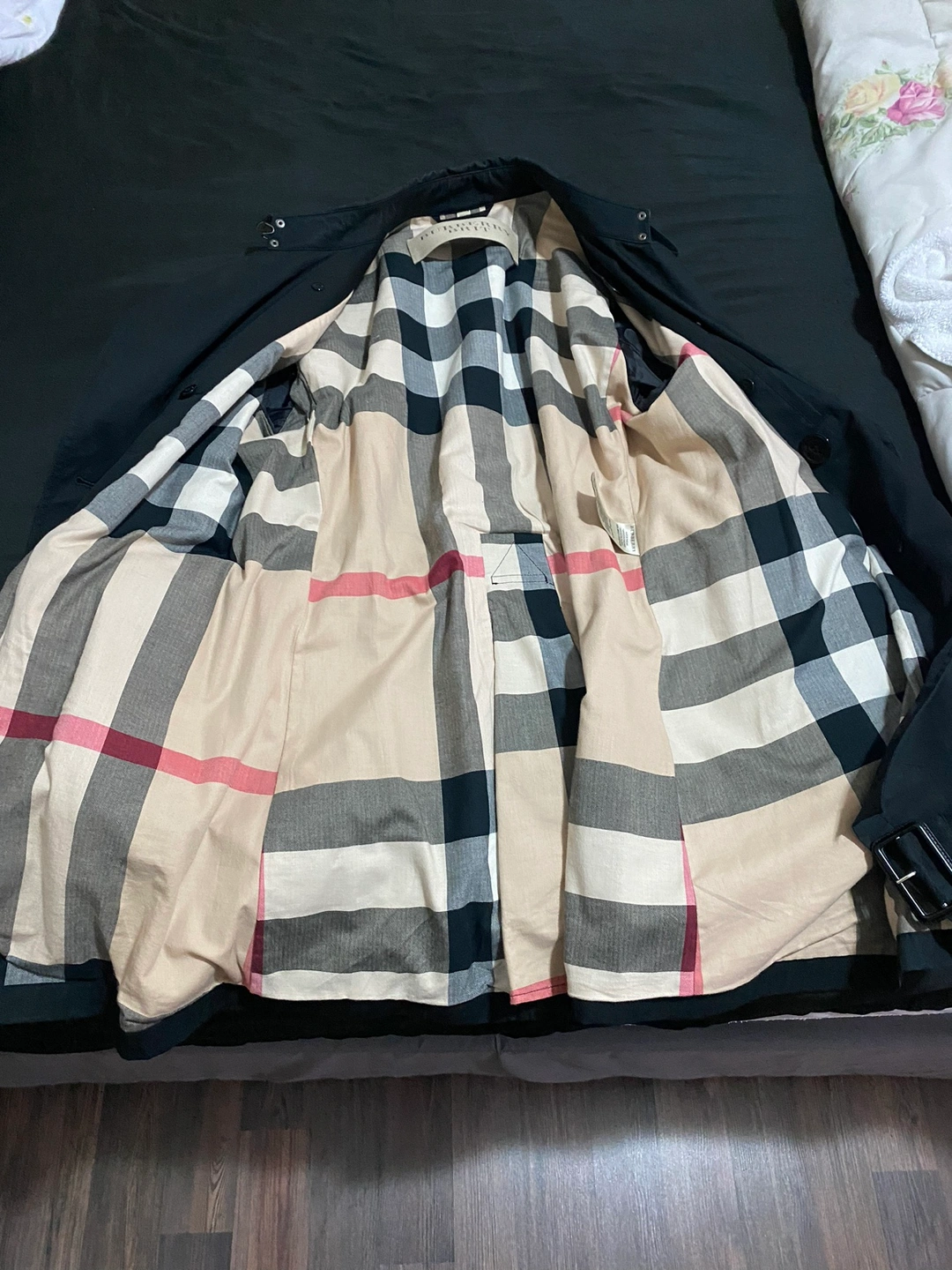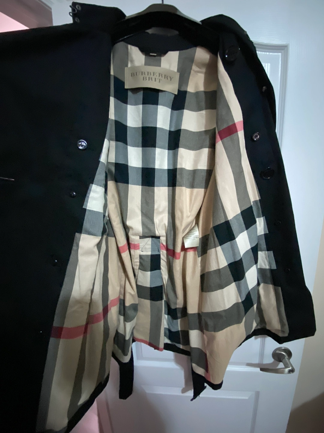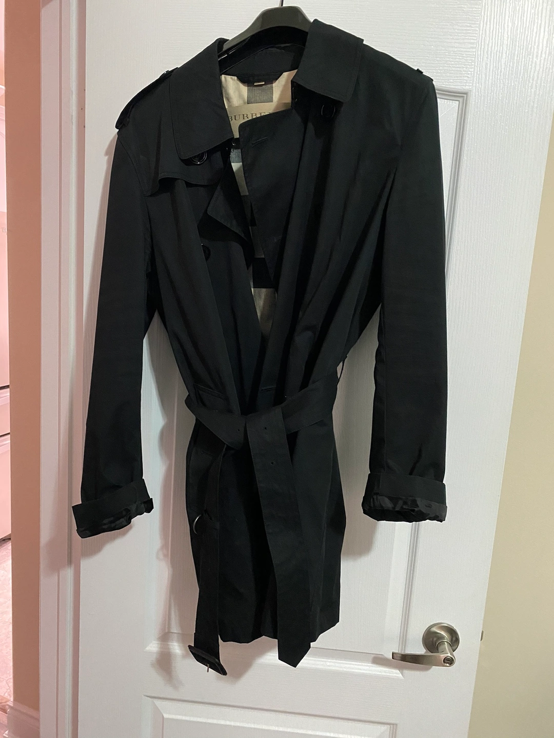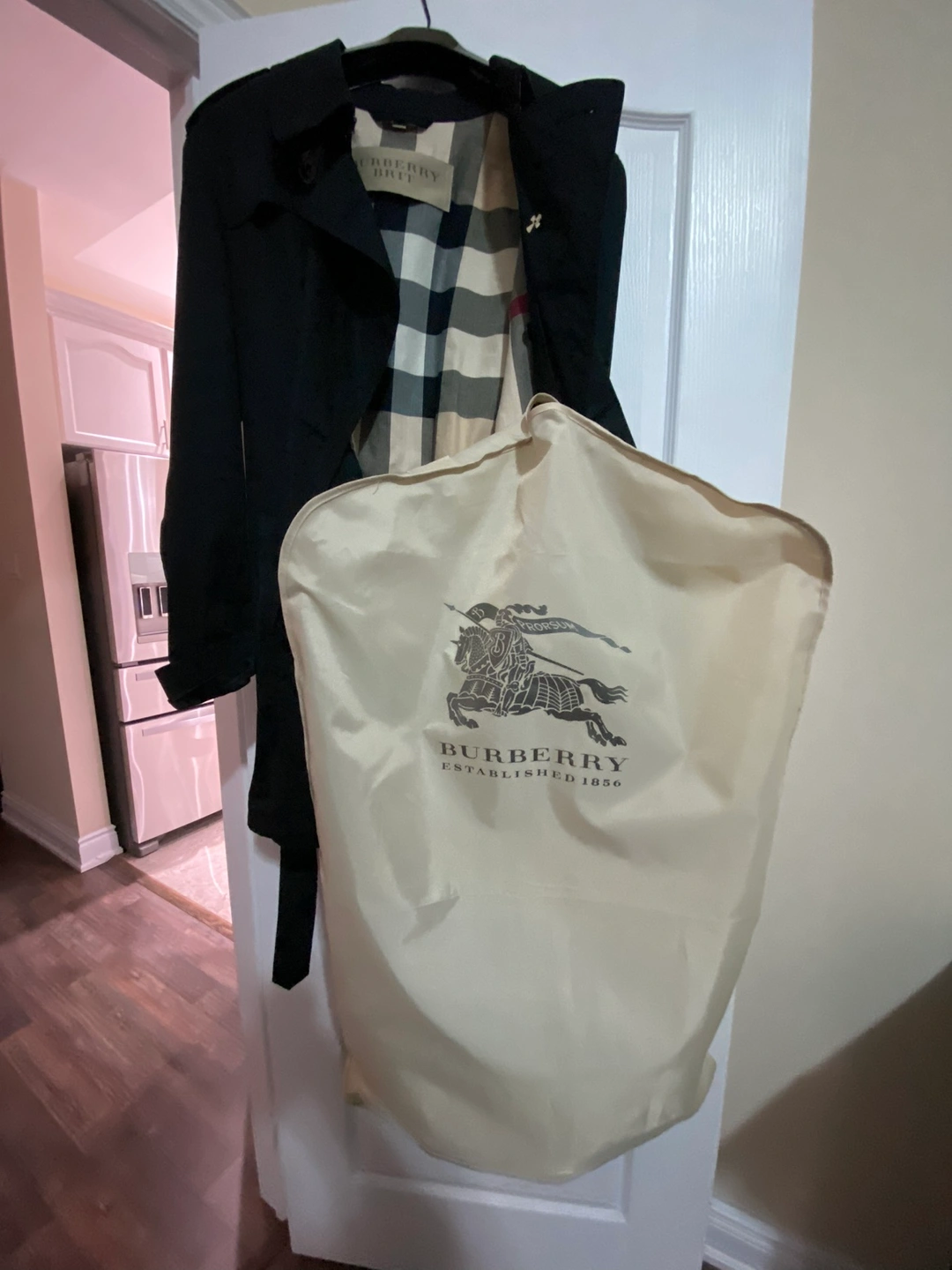 Black Burberry trench coat with classic details including a belt and a plaid lining. The coat has a double-breasted closure and two front pockets. Comes with a Burberry garment bag.