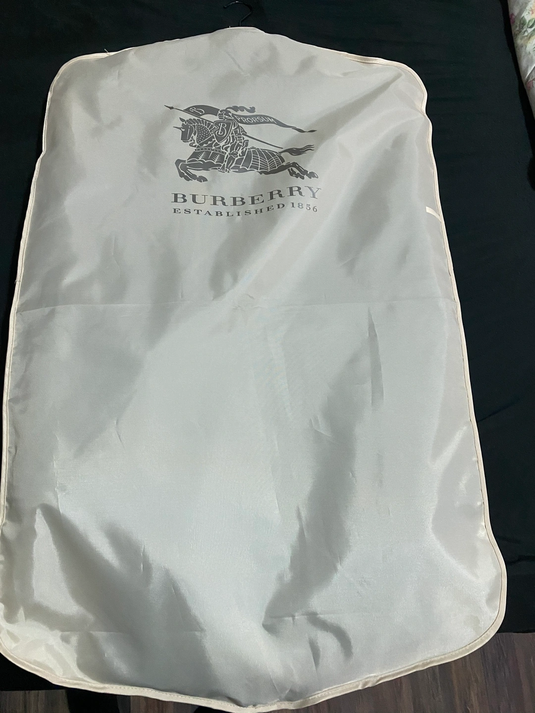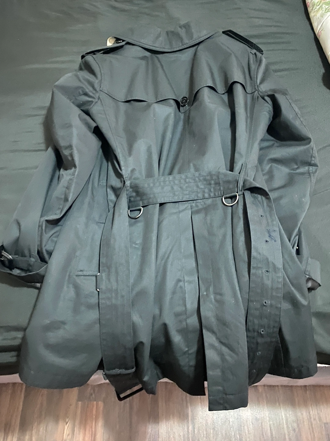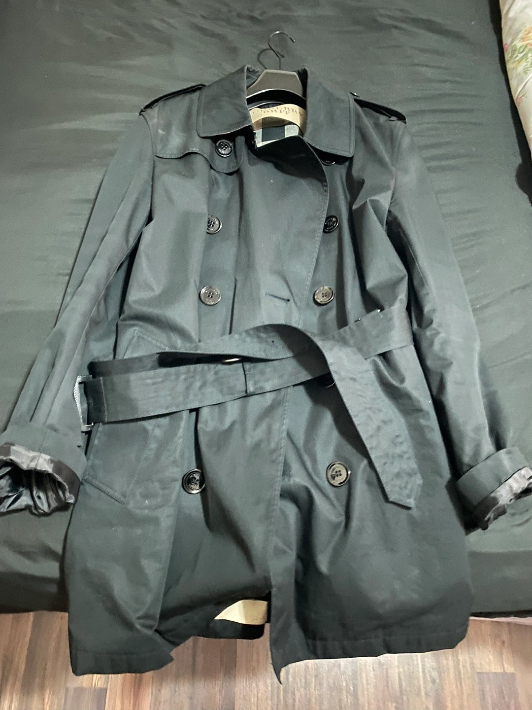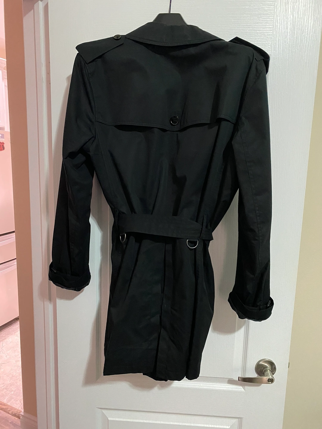 Black Burberry trench coat with classic details including a belt and a plaid lining. The coat has a double-breasted closure and two front pockets. Comes with a Burberry garment bag.
