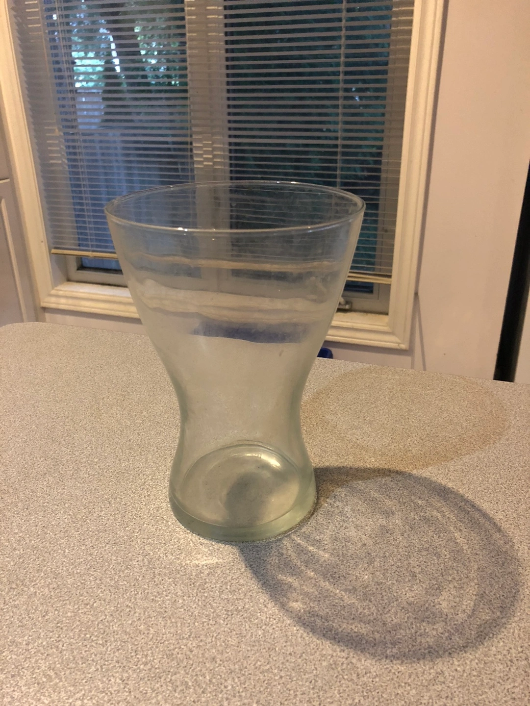 This is a glass vase. It is clear and has a flared opening. It measures approximately 10 inches tall and 5 inches wide. The vase is in good condition and would be a great addition to any home.