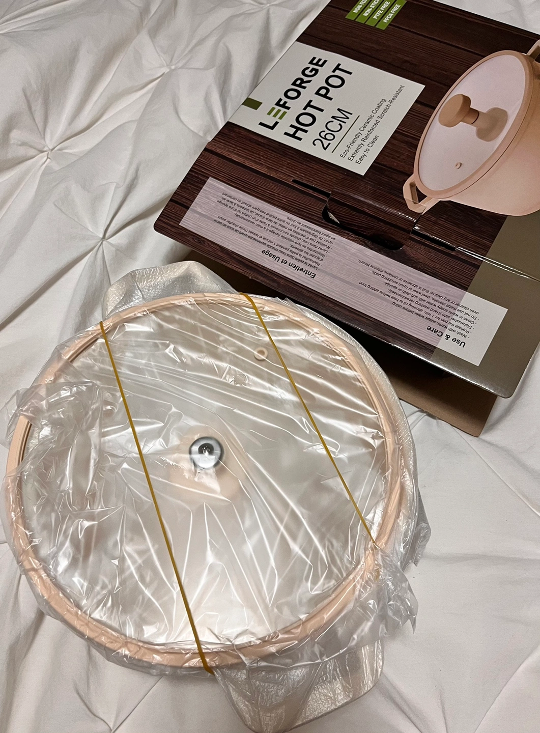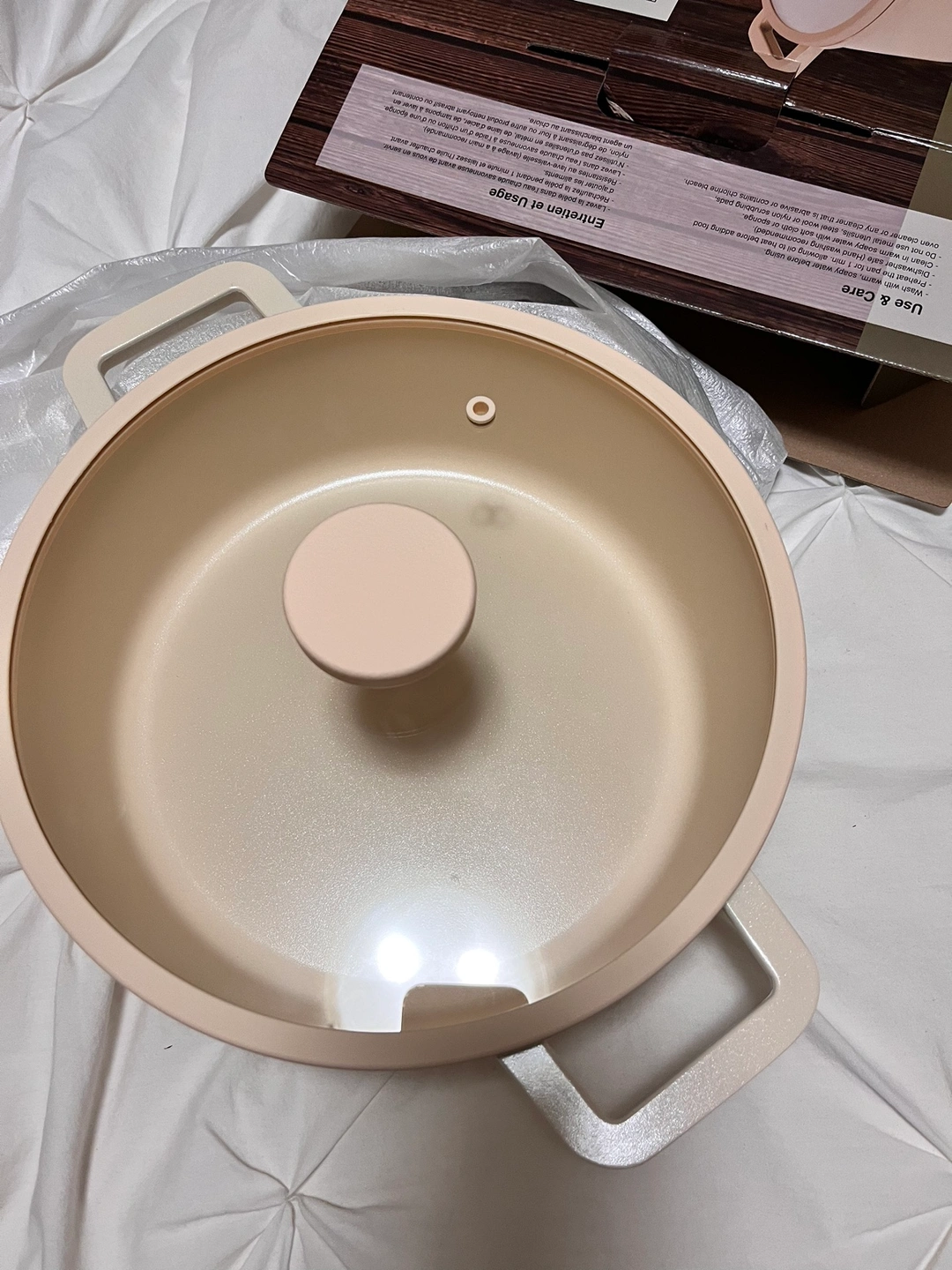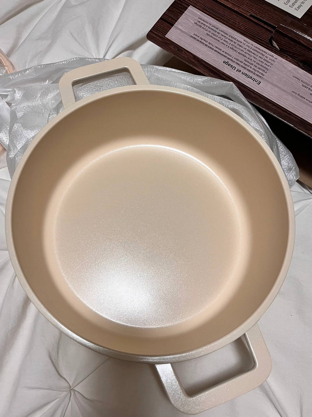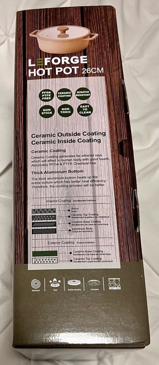 Totally Brand New Le Forge ceramic hot pot with lid. 26 cm in diameter. Comes in a cream colour is non-stick, non-toxic, PFOA-free and PTFE-free
