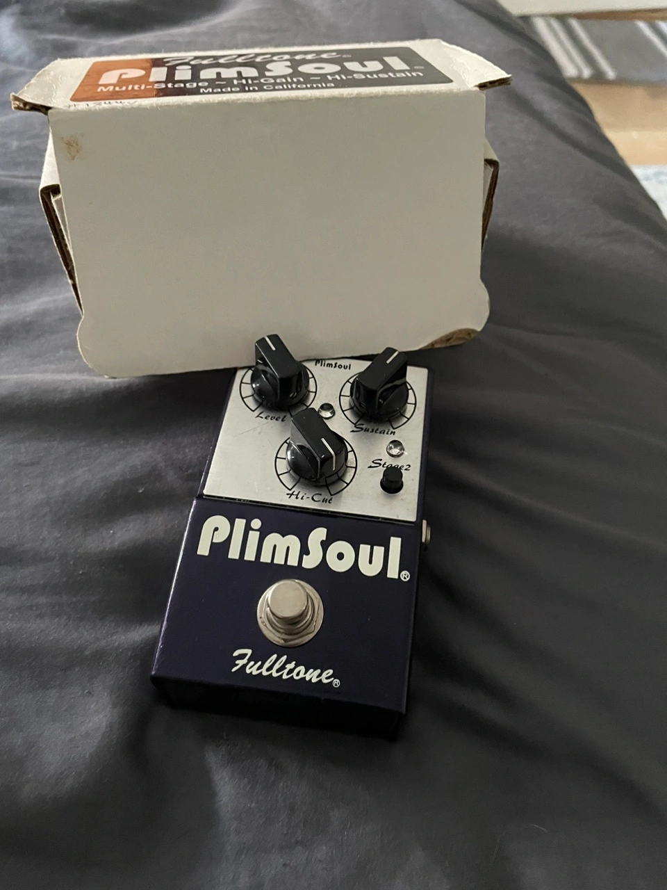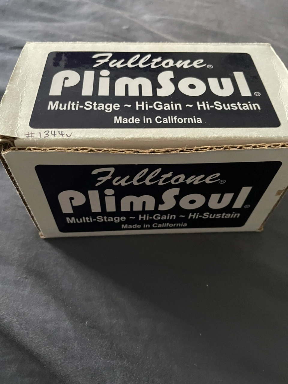 This is a Fulltone Plimsoul Overdrive Pedal in the original box. It features Hi-Gain and Hi-Sustain with multi-stage technology. Made in California.