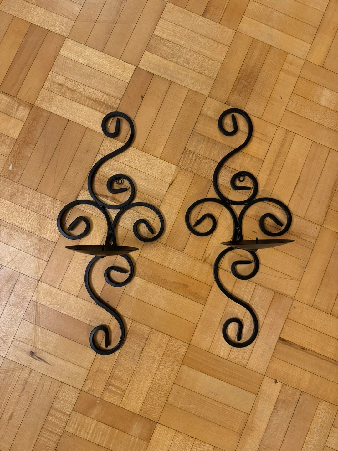 Each holder has a circular plate for a pillar candle. The holders are made of metal.