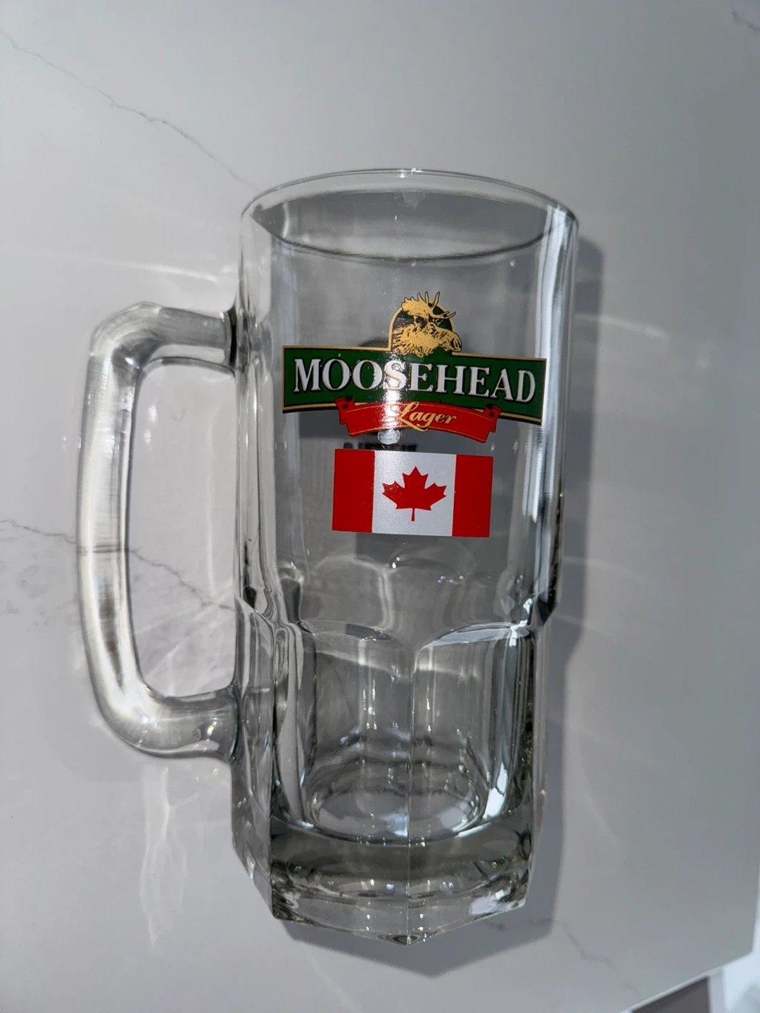 This glass beer mug features logos for Moosehead Lager with a Canadian flag and Buffalo Wild Wings. It has a sturdy handle and a classic dimpled design. Great for enjoying your favourite cold beverage! Length 9inch