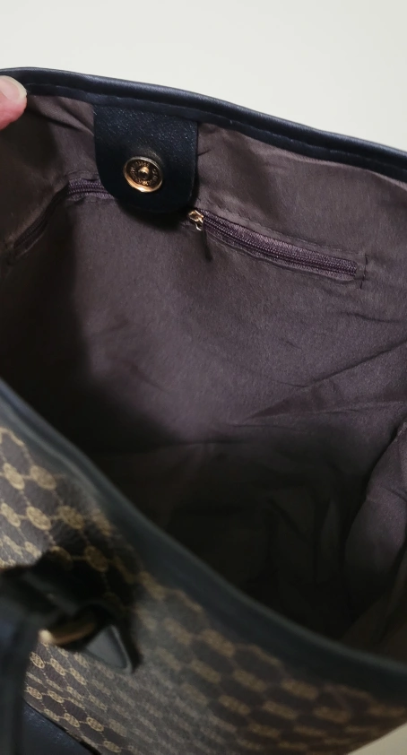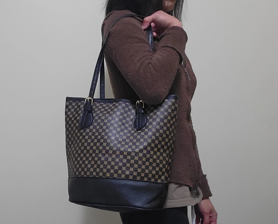 This is a large tote bag with a brown and black pattern. It features two straps and a zippered pocket on the inside. The bag Dimension 10.5"Hx12"Lx5"W. It is in great condition and ready to be used.