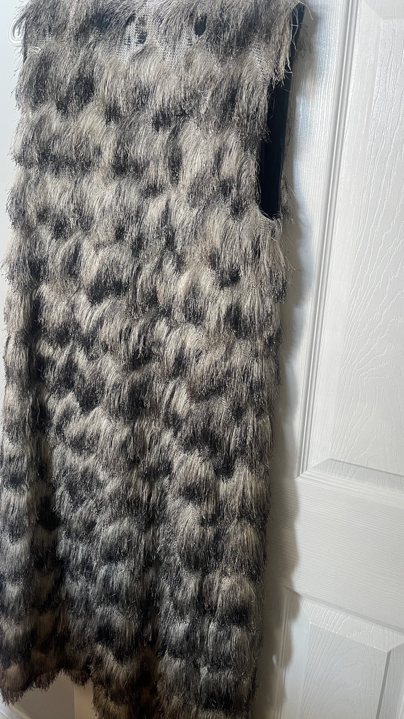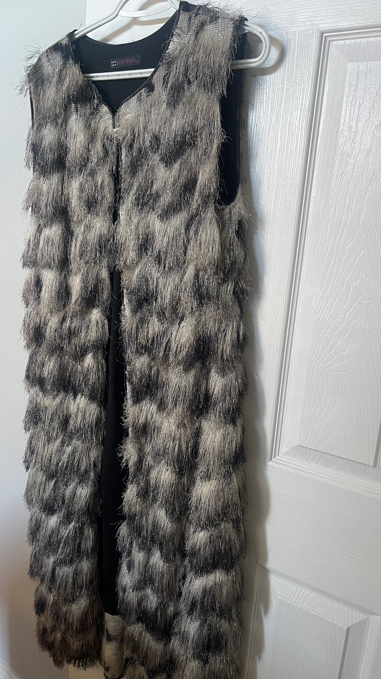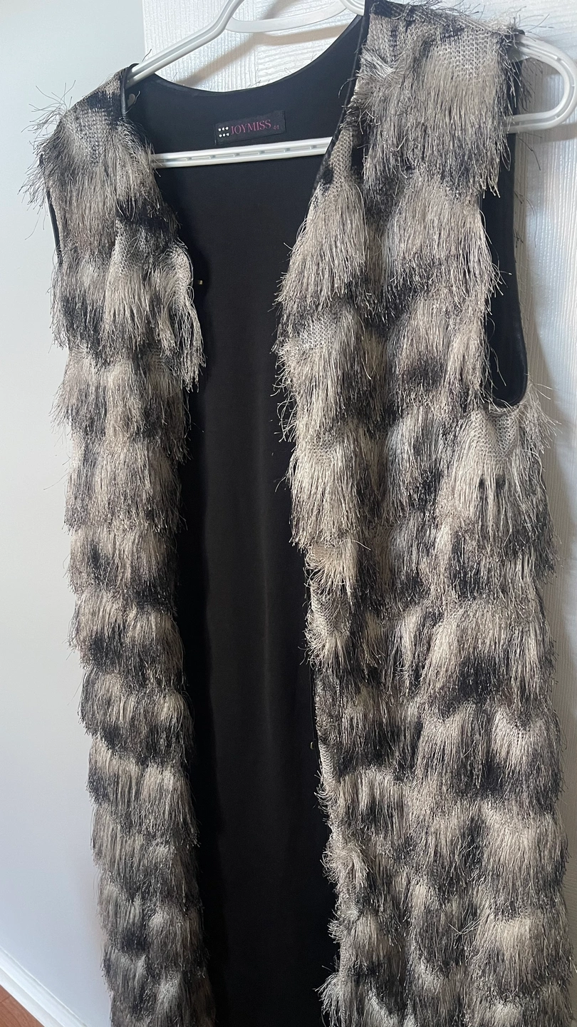 Black sleeveless vest with silver and black fringe. The vest is made of a soft, silky fabric. It has a v-neck and is approximately 28 inches in length. It has a hook and eye closure. The vest is perfect for adding a touch of glam to any outfit.