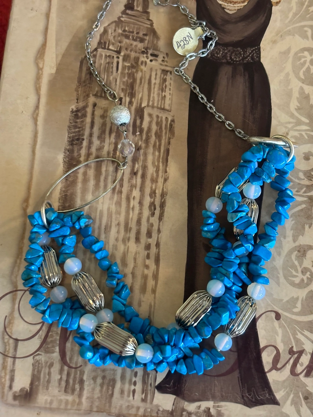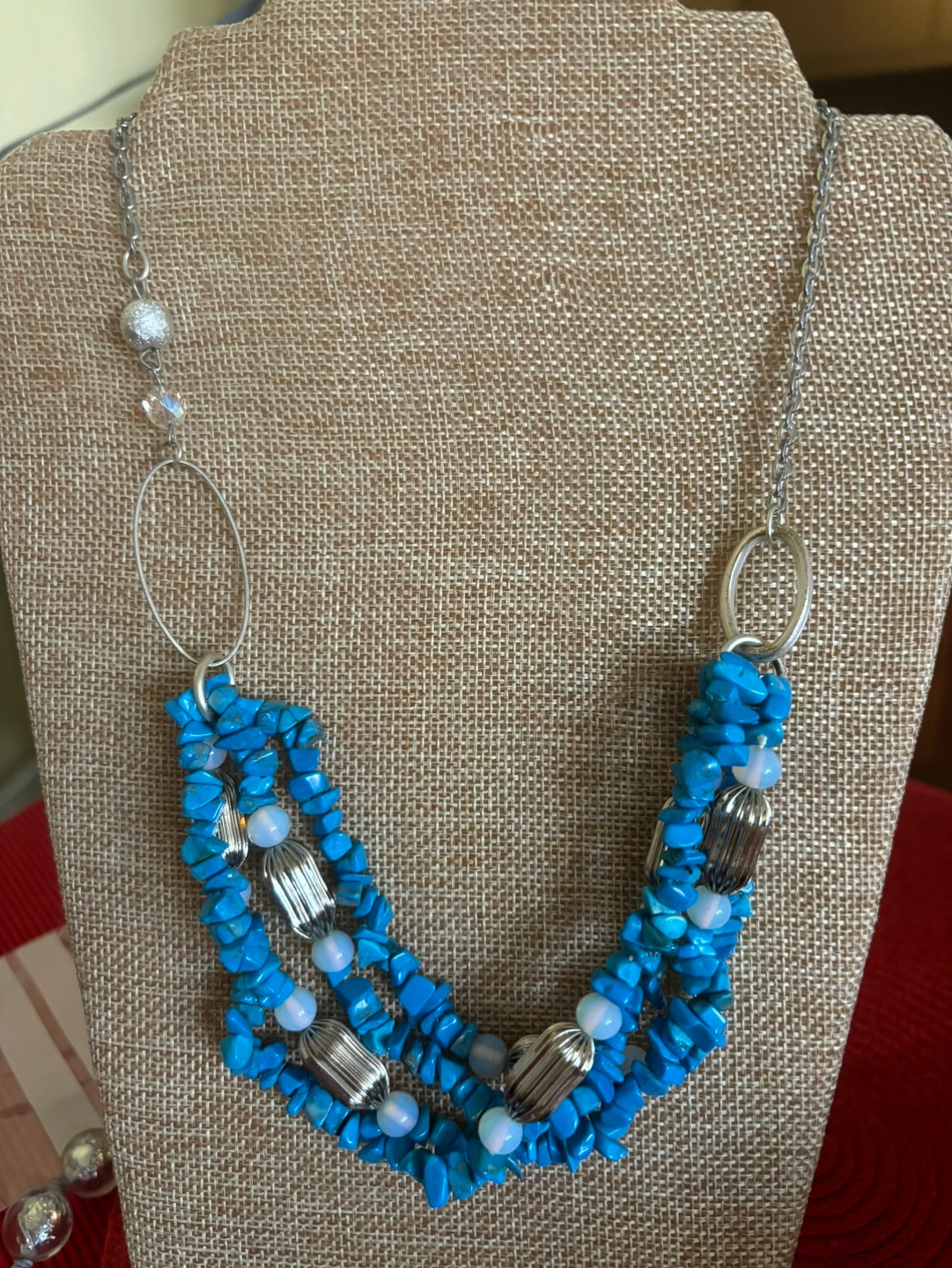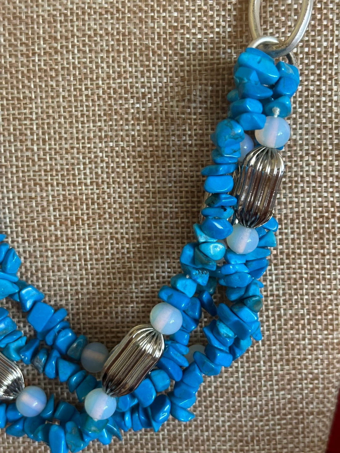 This necklace is a beautiful combination of blue stones and silver accents. The necklace is made of multiple strands of blue howlite chips, opalite and features silver vintage accents. The necklace is adjustable in length. 21”