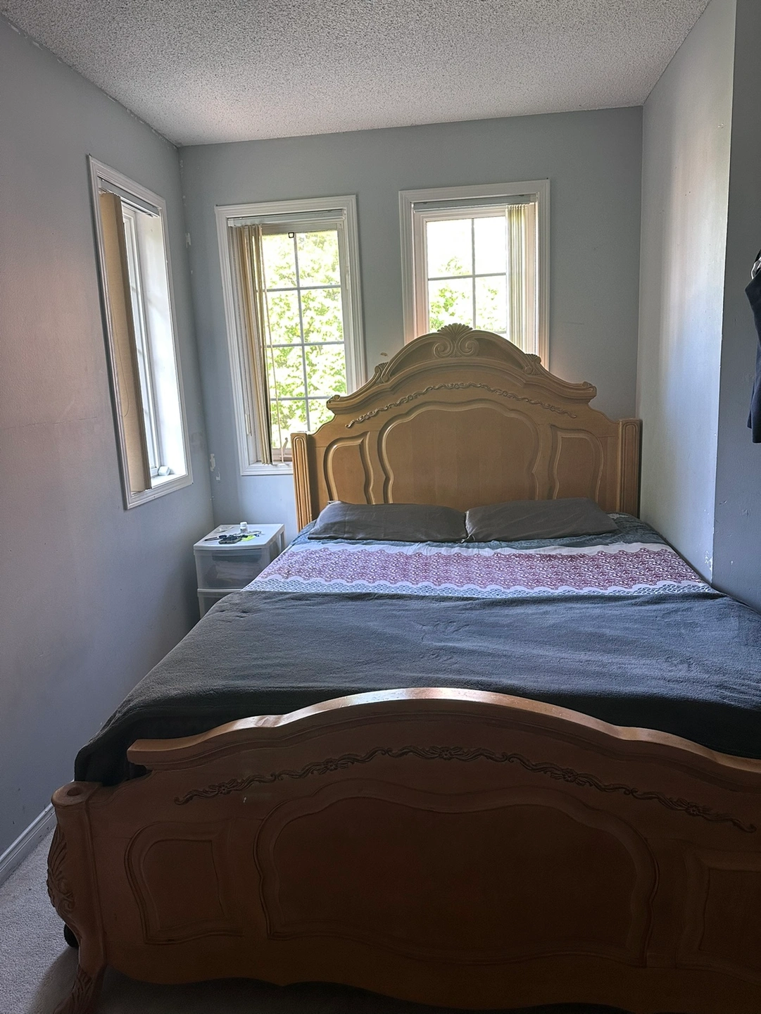 Wooden bed frame in great condition with a headboard, footboard, and side rails. This bed frame include a mattress and box spring. It is designed to be used with a standard Queen mattress size. This bed frame features elegant carvings in the wood and a classic design. The bed frame is in good condition and would be a beautiful addition to any bedroom.