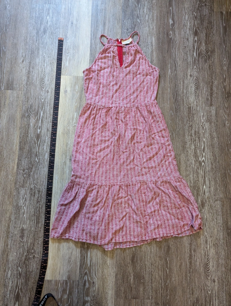 A red and white striped summer dress. It is a halter top with a zipper in the back and a tiered skirt. Size XS