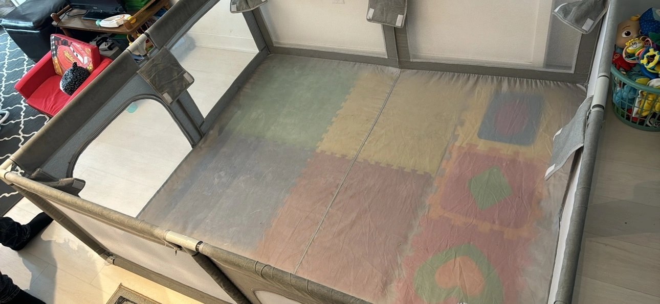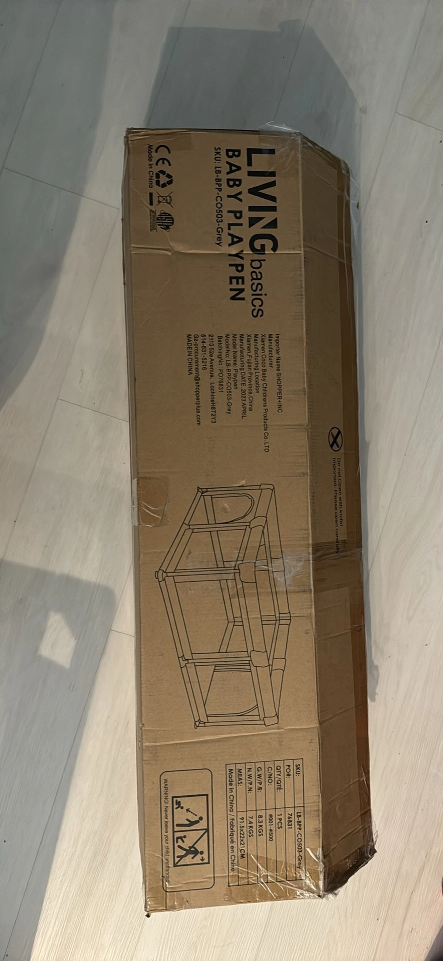 Measurements are on the box Comes with all pieces and instructions, does not come with the coloured mats under it. The fabric part needs to be cleaned, I just don’t have a washing machine big enough to fit it, but otherwise good condition no rips or tears.