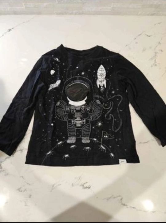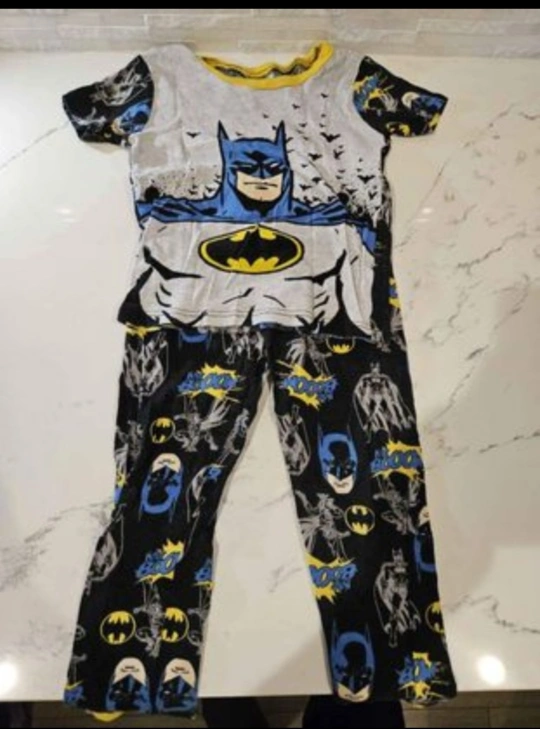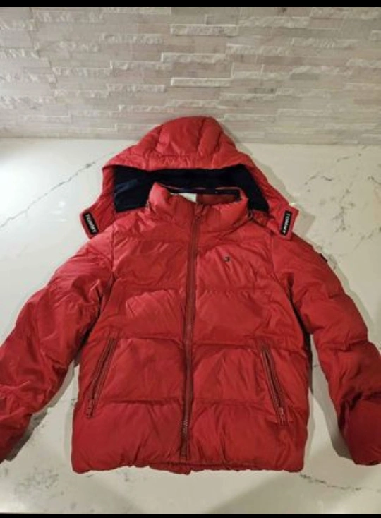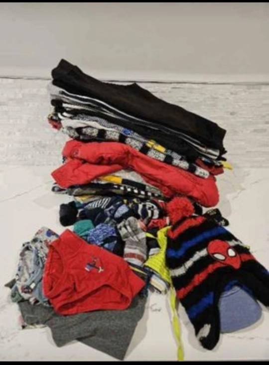 10A bundle of boys' clothing for 3-4 year old. Includes a red puffer jacket, striped sweater, various t-shirts, long sleeve shirts, pajama, underwear.