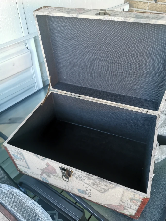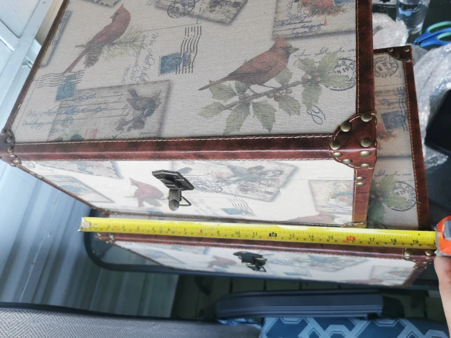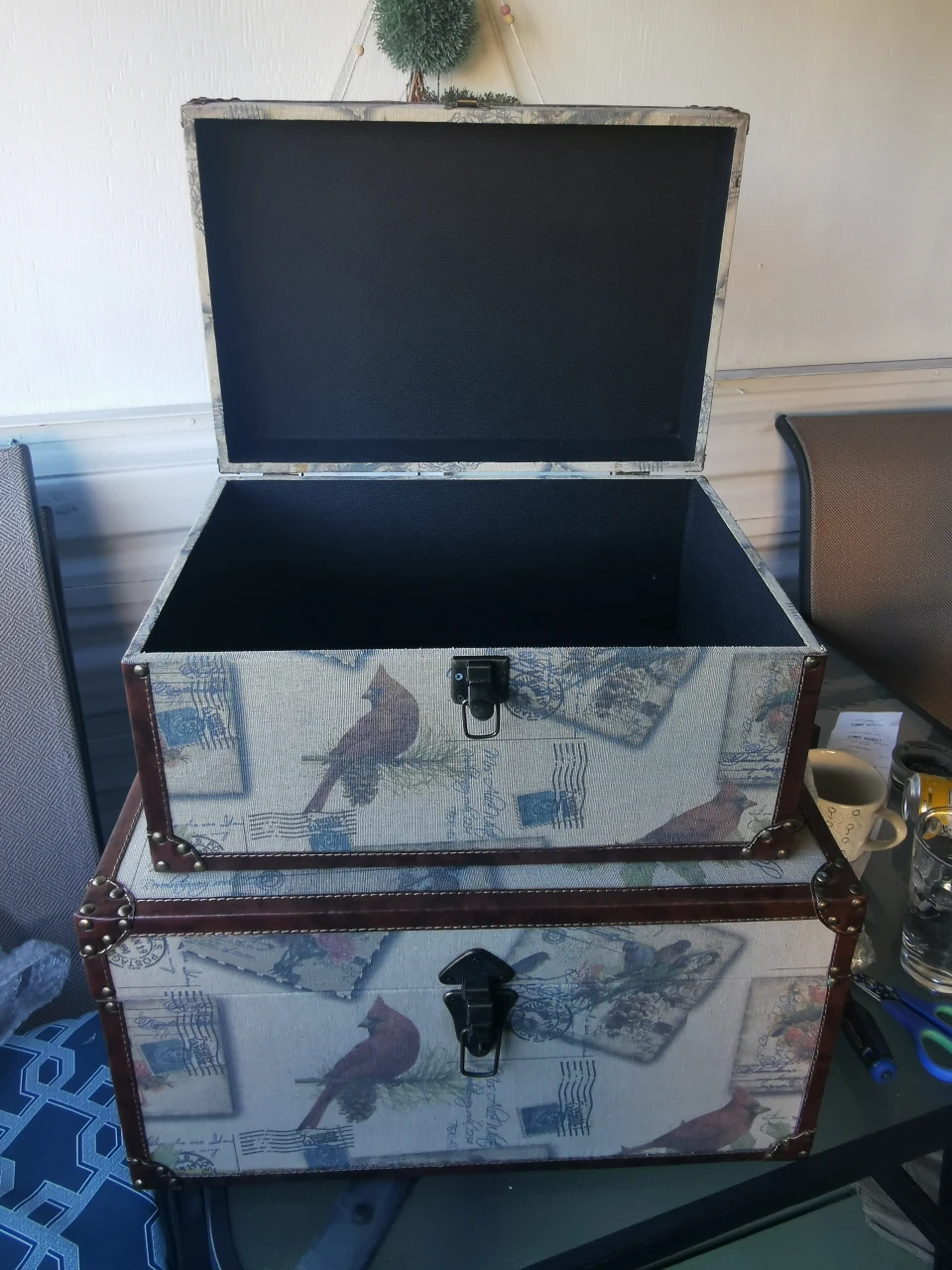 Two decorative storage boxes with a vintage design featuring birds and old post stamps. The boxes have a fabric exterior with a brown trim and metal accents.
