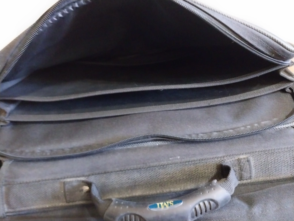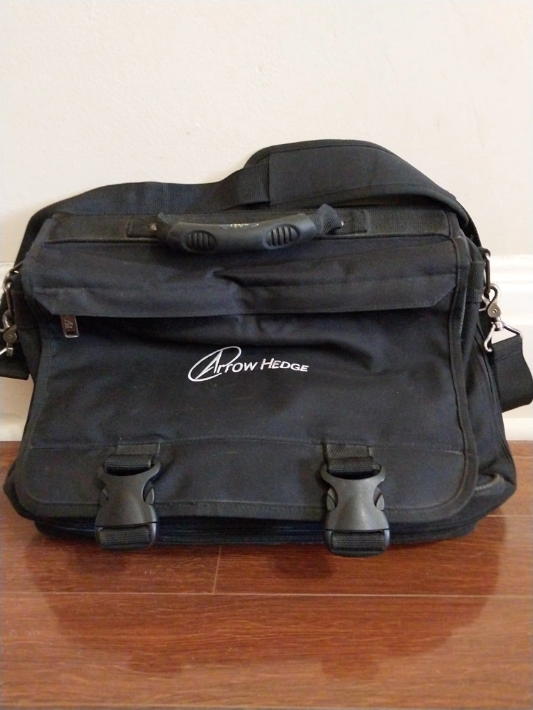 *Cash and pick up ONLY at location shown on ad* *NO trades or bargaining* ✅️Black messenger bag with two buckles on the front, a zippered pocket, and a zippered closure. The bag has a long adjustable shoulder strap. There is a small embroidered logo on the front. The bag has several compartments inside.