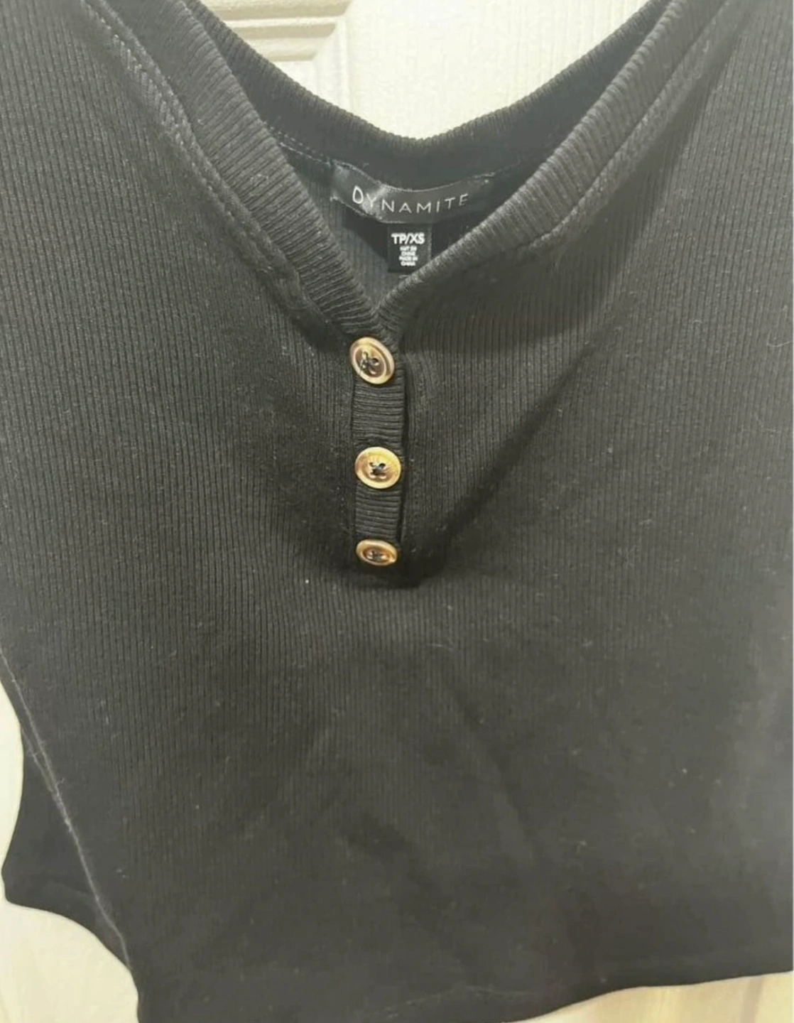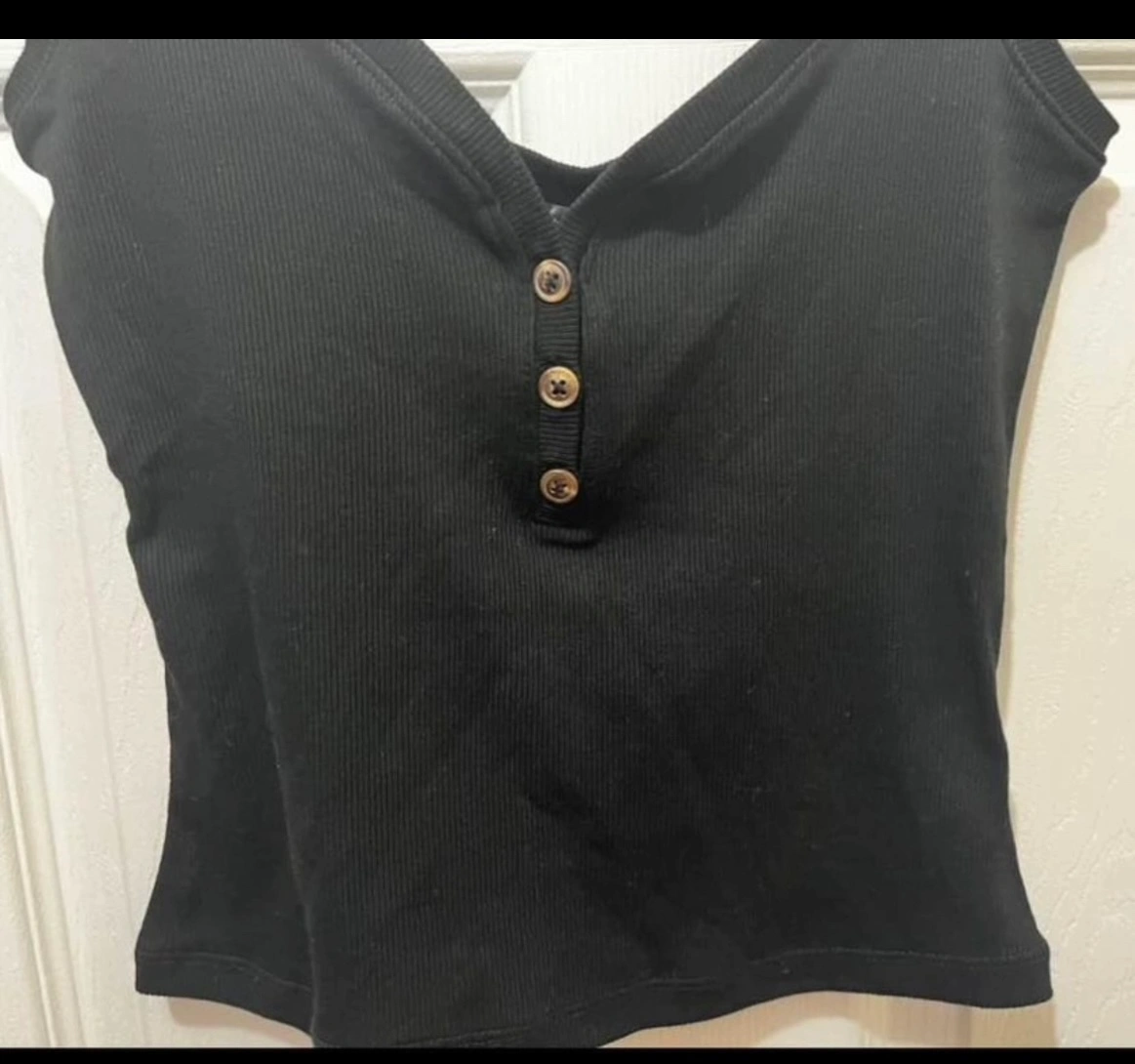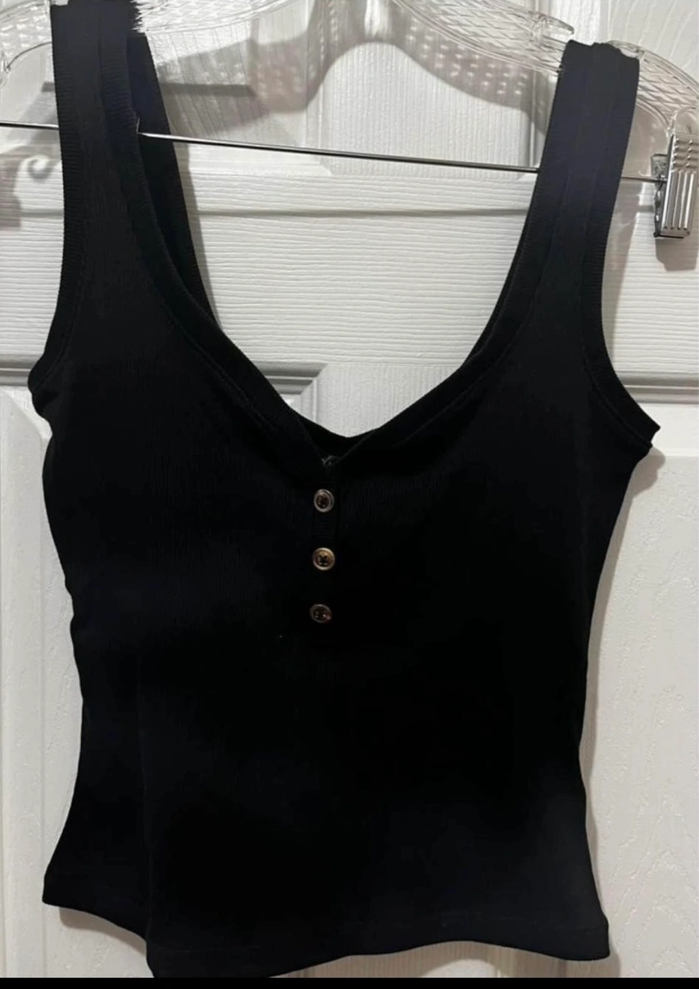 Black ribbed tank top with button detailing. This is a great tank for layering or on its own with high waisted bottoms. Barely used. Like new condition. Pick up at 385 Osler street.Cash only.