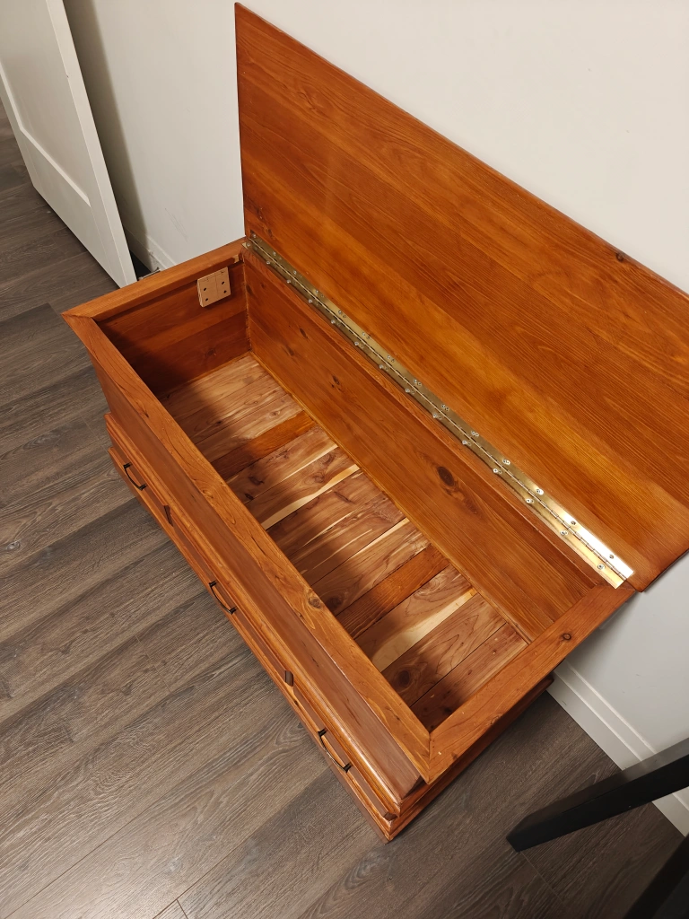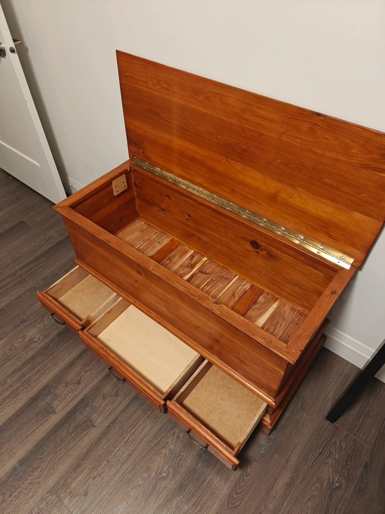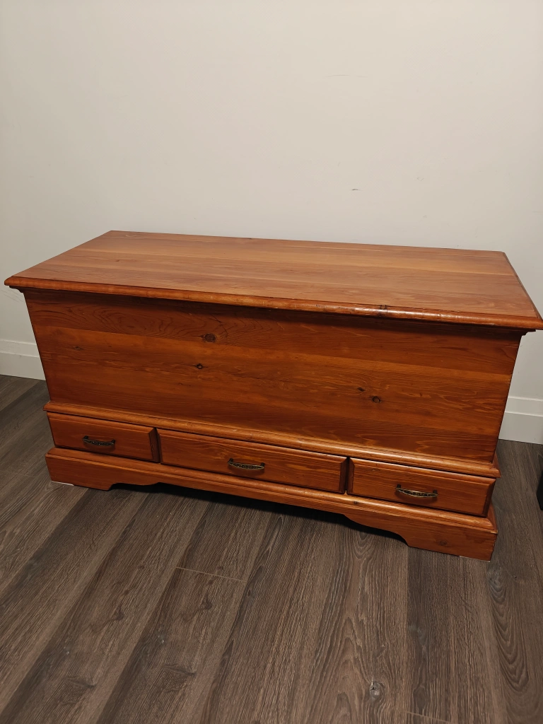 Real wood chest. Very minor wear on it. Weighs about 30lbs.